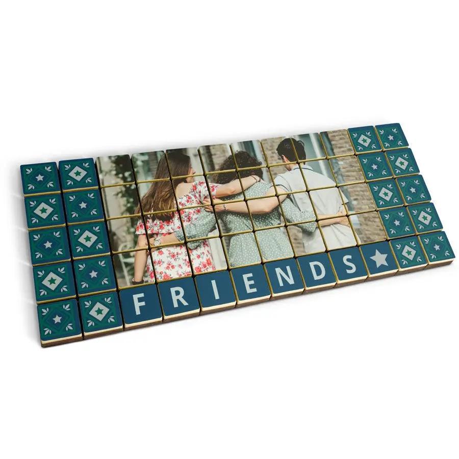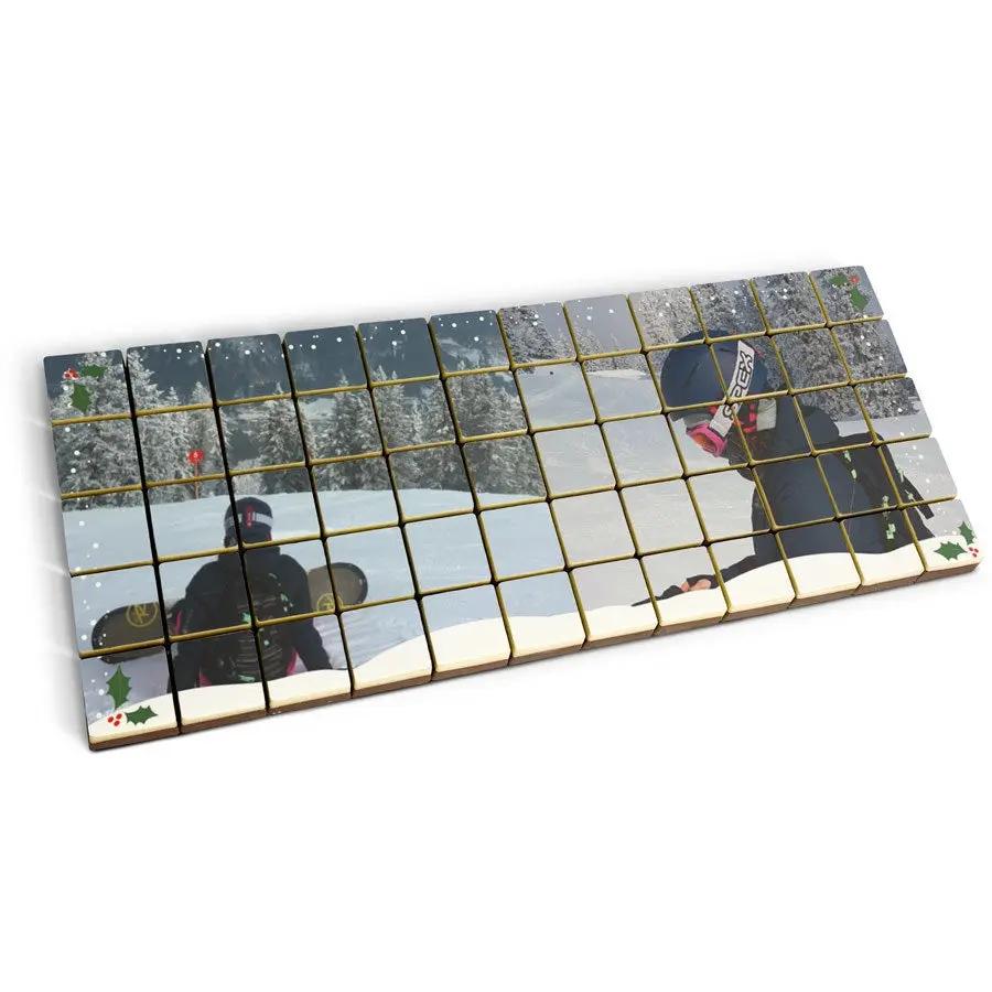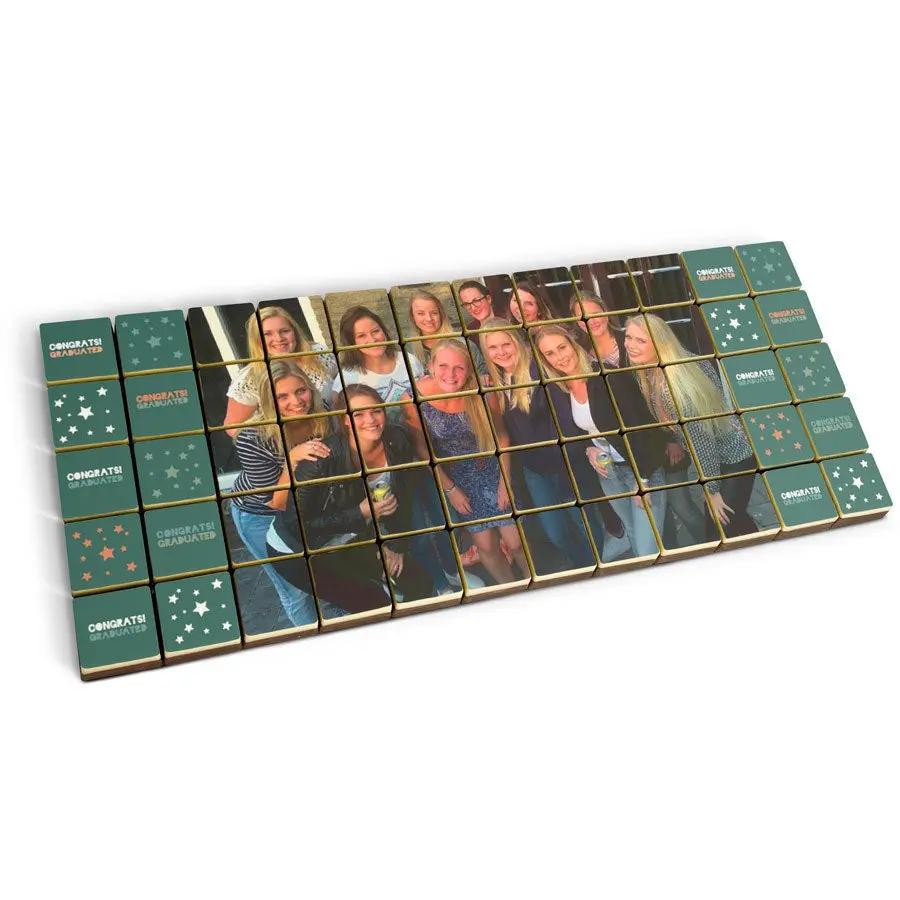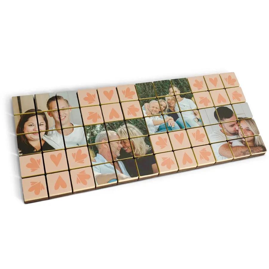 Mehr Informationen zum Foto der Vollmilchschokolade: Menge: 60 Pralinen Schokolade: Milchschokolade mit einer Schicht weißer Schokolade obendrauf Maße pro Praline: 2,5 x 2,5 x 1,2 cm Maße pro Set: 23 x 18 x 2,5 cm Personalisierung: mit Foto oder Logo bedruckt Druck: essbarer Druck in Vollfarbe Bei Temperaturen ab 25 °C empfehlen wir Ihnen, Ihrer Bestellung ein Kühlelement beizufügen. Aufbewahrungshinweis: Kühl und dunkel bei 14–18 °C bis zu 10 Wochen haltbar. Allergiehinweis: Enthält Soja, Milch und kann Spuren von Schalenfrüchten enthalten. Zutaten: Milchschokolade: Zucker, Kakaobutter, Vollmilchpulver, Kakaomasse, Emulgator (Sojalecithin), natürliches Vanillearoma. Mindestens 34 % Kakaoanteil. Weiße Schokolade: Zucker, Kakaobutter, Vollmilchpulver, Emulgator (Sojalecithin), natürliches Vanillearoma. Mindestens 29 % Kakaoanteil.