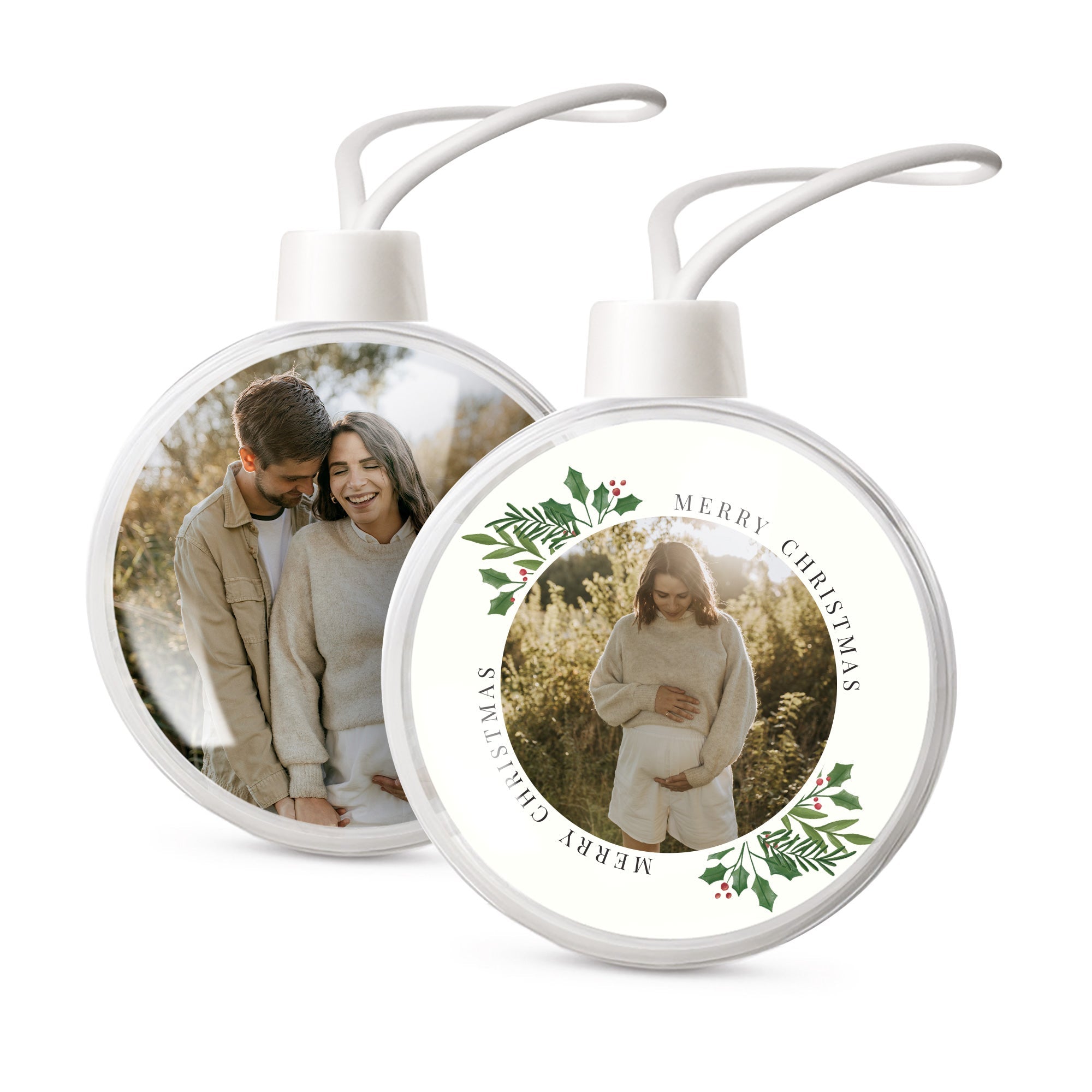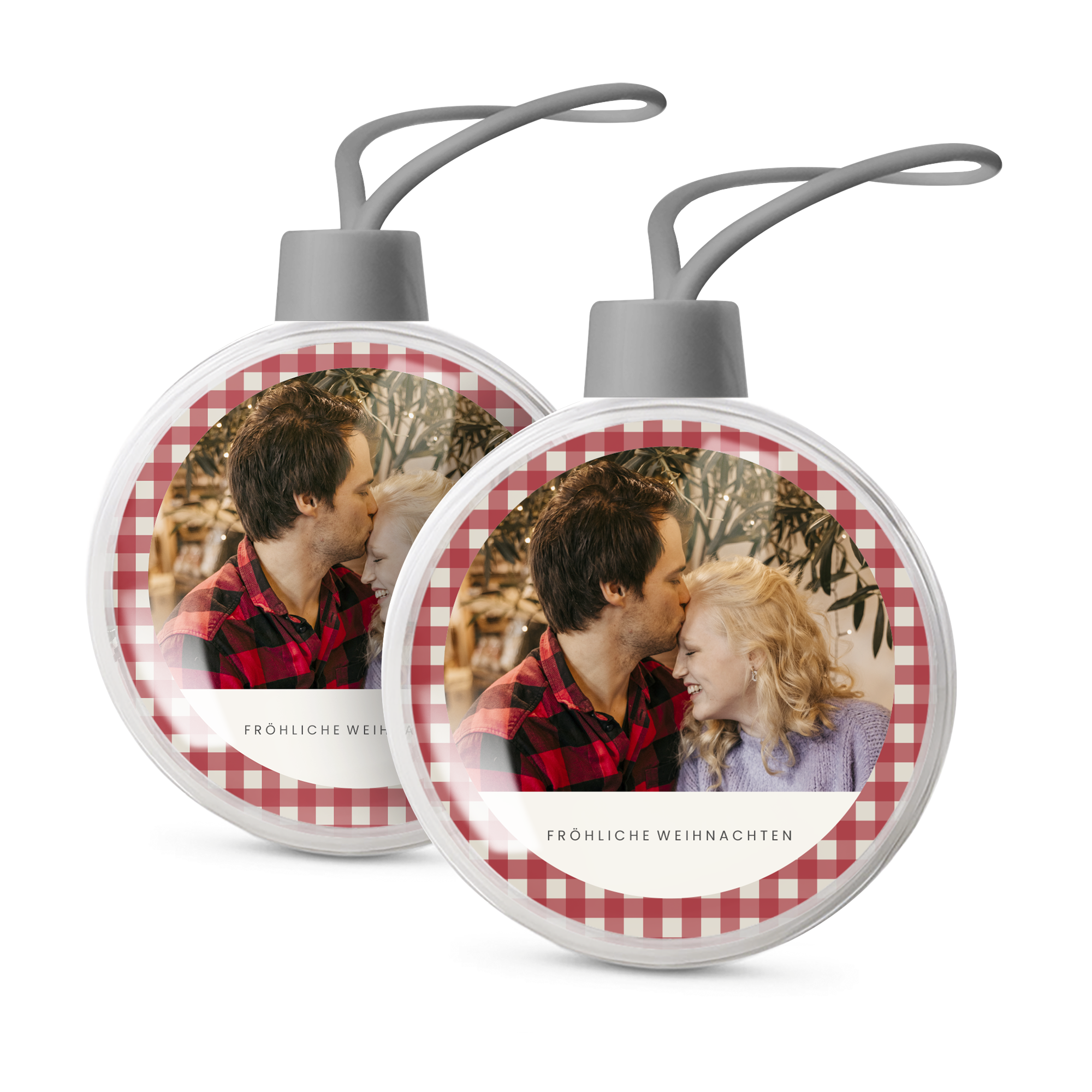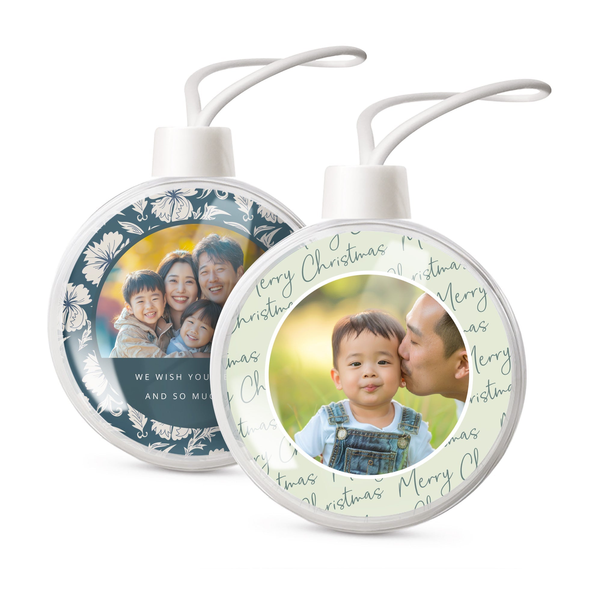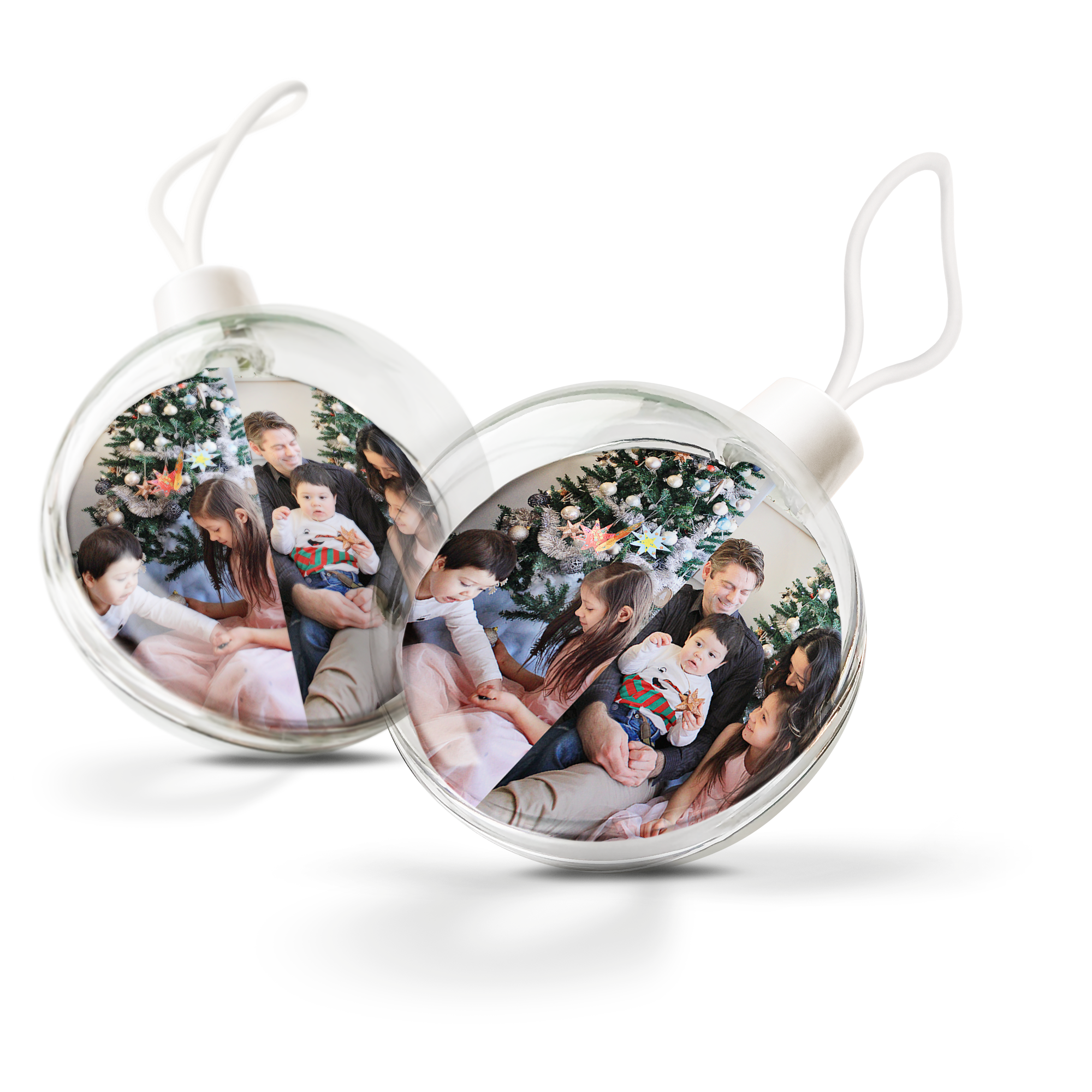 Ihr eigenes Foto und Text in personalisierten transparenten Weihnachtskugeln. Doppelseitiges Bild!