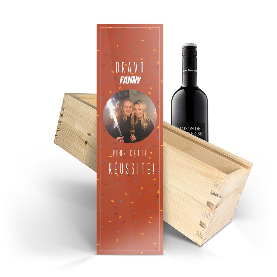 Köstlicher Wein von Maison de la Surprise in einer luxuriösen Holzkiste mit Foto, Logo und/oder Text Ihrer Wahl. Gestalten Sie jetzt Ihre eigene!