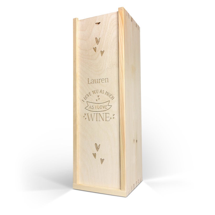Köstlicher Wein von Maison de la Surprise in einer luxuriösen Holzkiste mit dem Namen und/oder Text Ihrer Wahl. Gestalten Sie jetzt Ihre eigene!