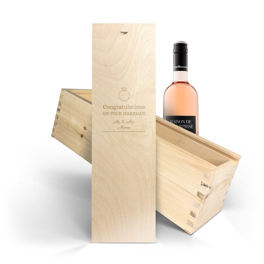 Köstlicher Maison de la Surprise Wein in einer Deluxe-Holzkiste mit dem Namen und/oder Text Ihrer Wahl. Gestalten Sie jetzt Ihre eigene!