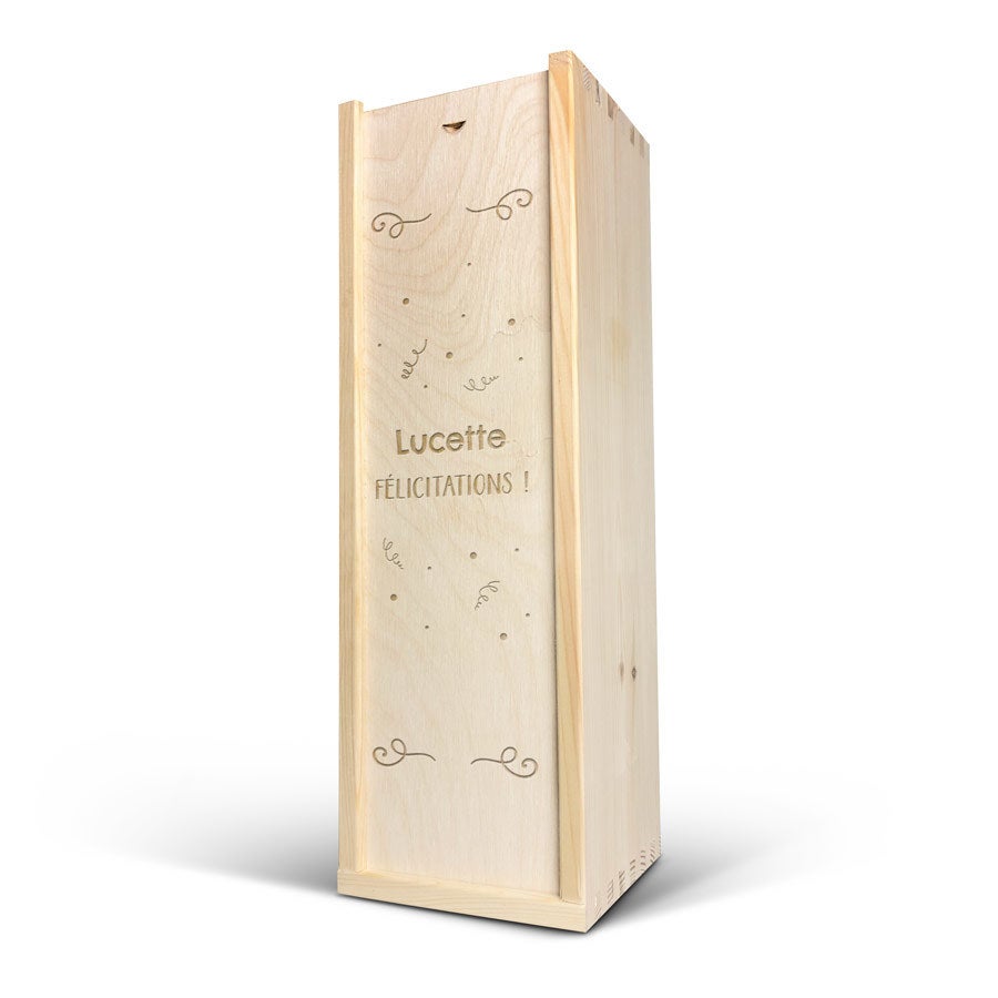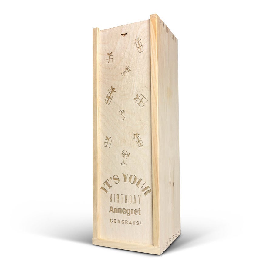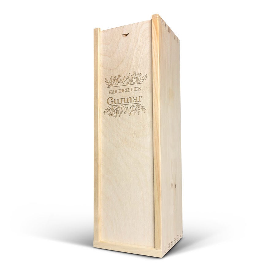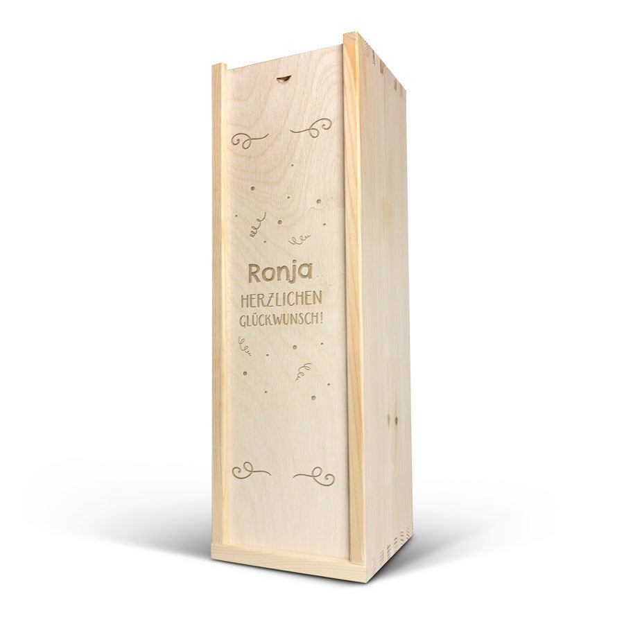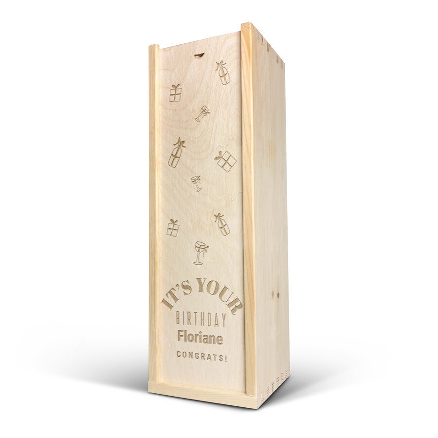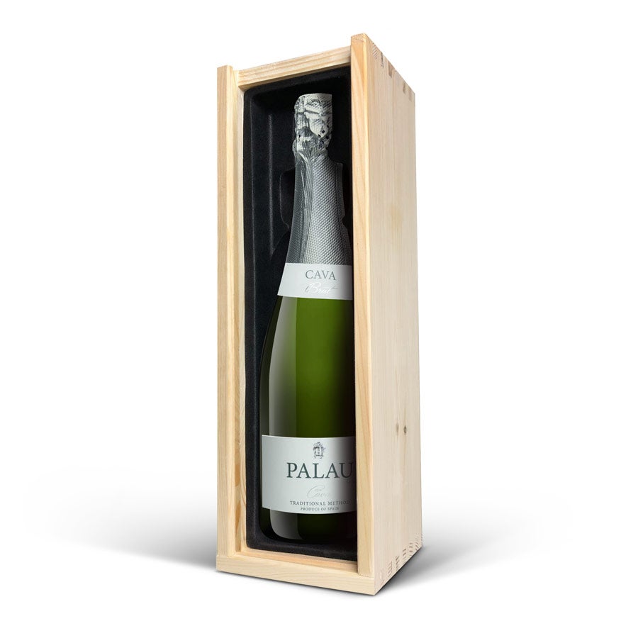 Eine köstliche Flasche Sekt Cava Palau Gazo in einer gravierten Kiste. Personalisieren Sie sie nach Belieben mit Ihrem Text in einem einzigartigen Design!