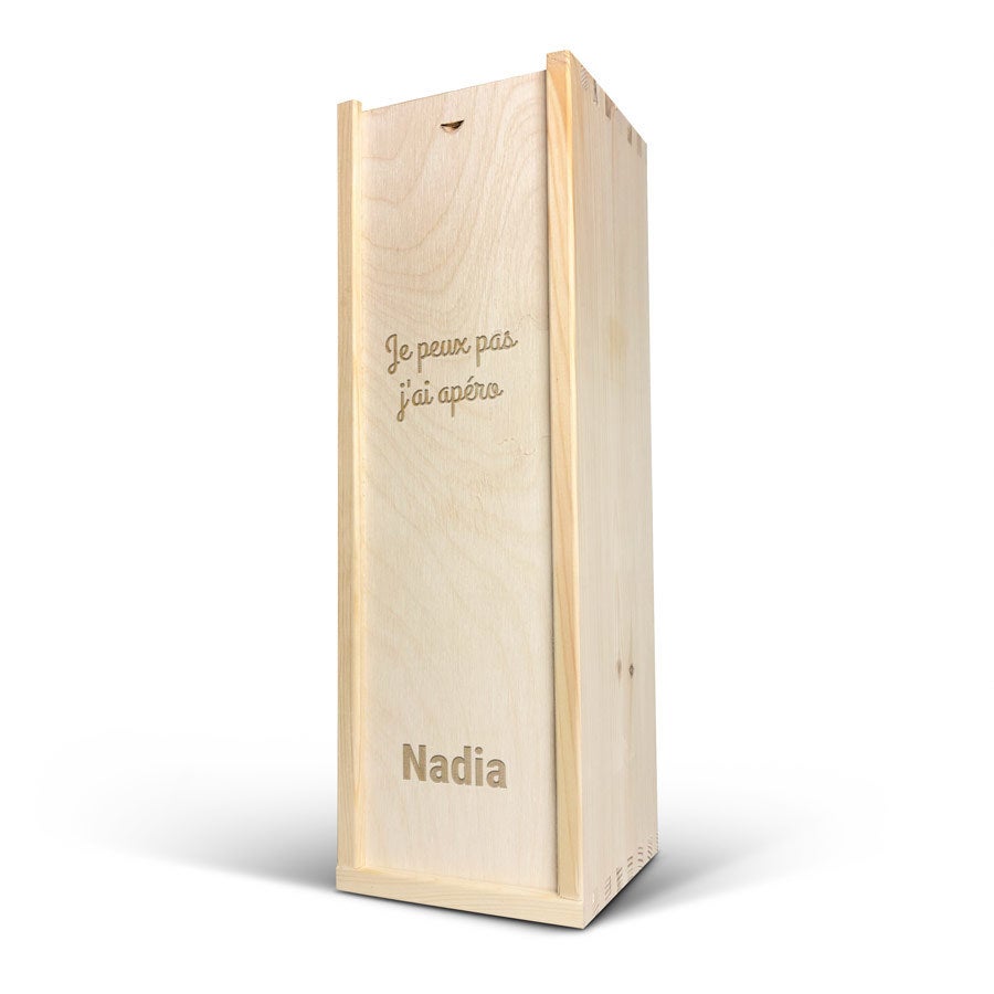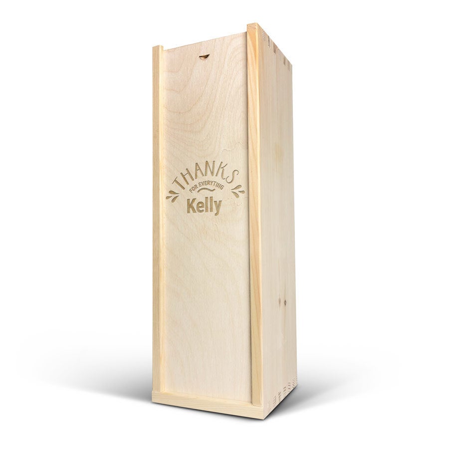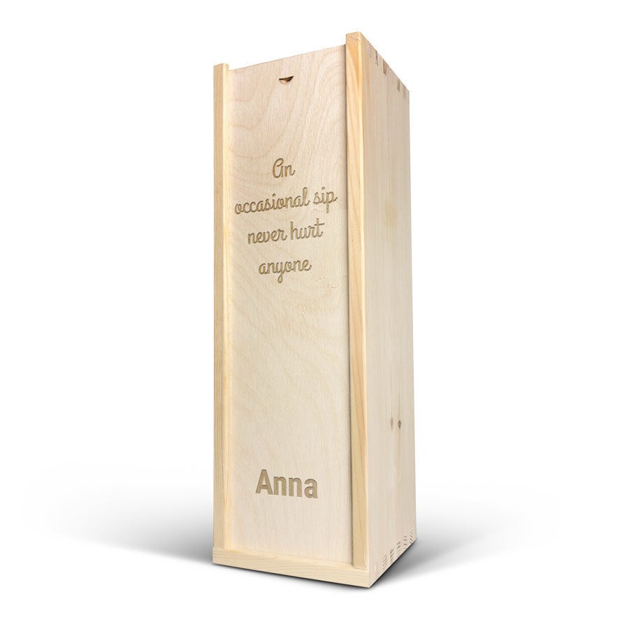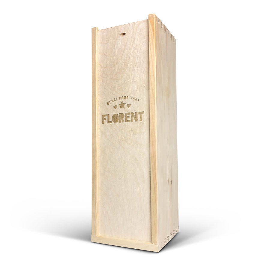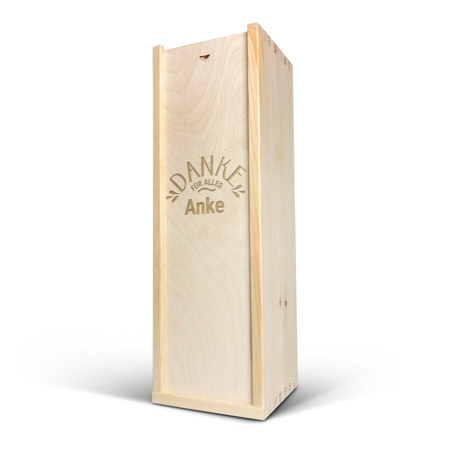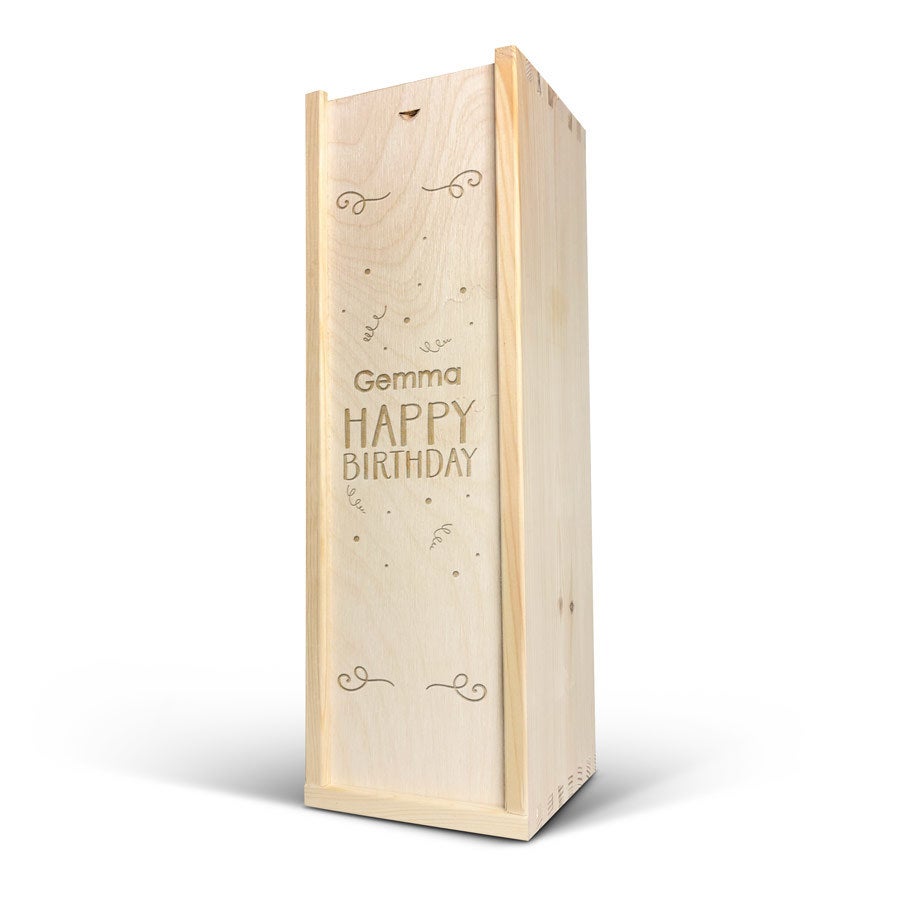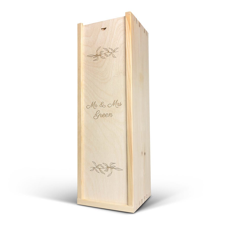 Eine köstliche Flasche Sekt Cava Palau Gazo in einer gravierten Kiste. Personalisieren Sie sie nach Belieben mit Ihrem Text in einem einzigartigen Design!