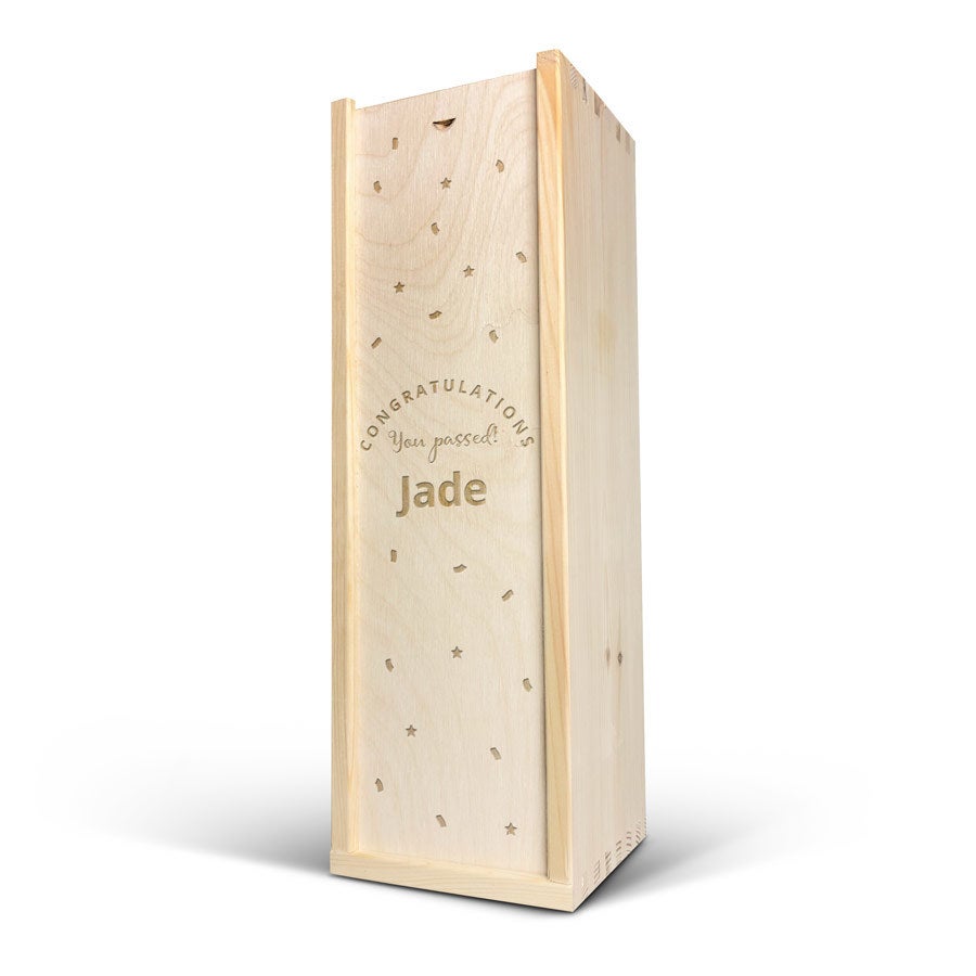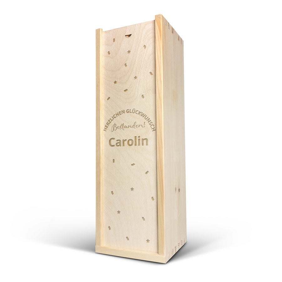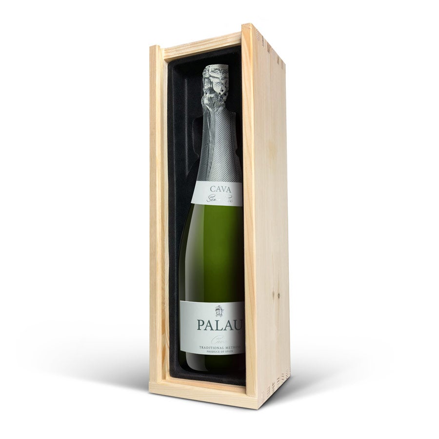 Eine köstliche Flasche Palau Semi-Seco Cava in einer luxuriösen Holzkiste mit eingraviertem Namen und/oder Text. Originelles Geschenk!