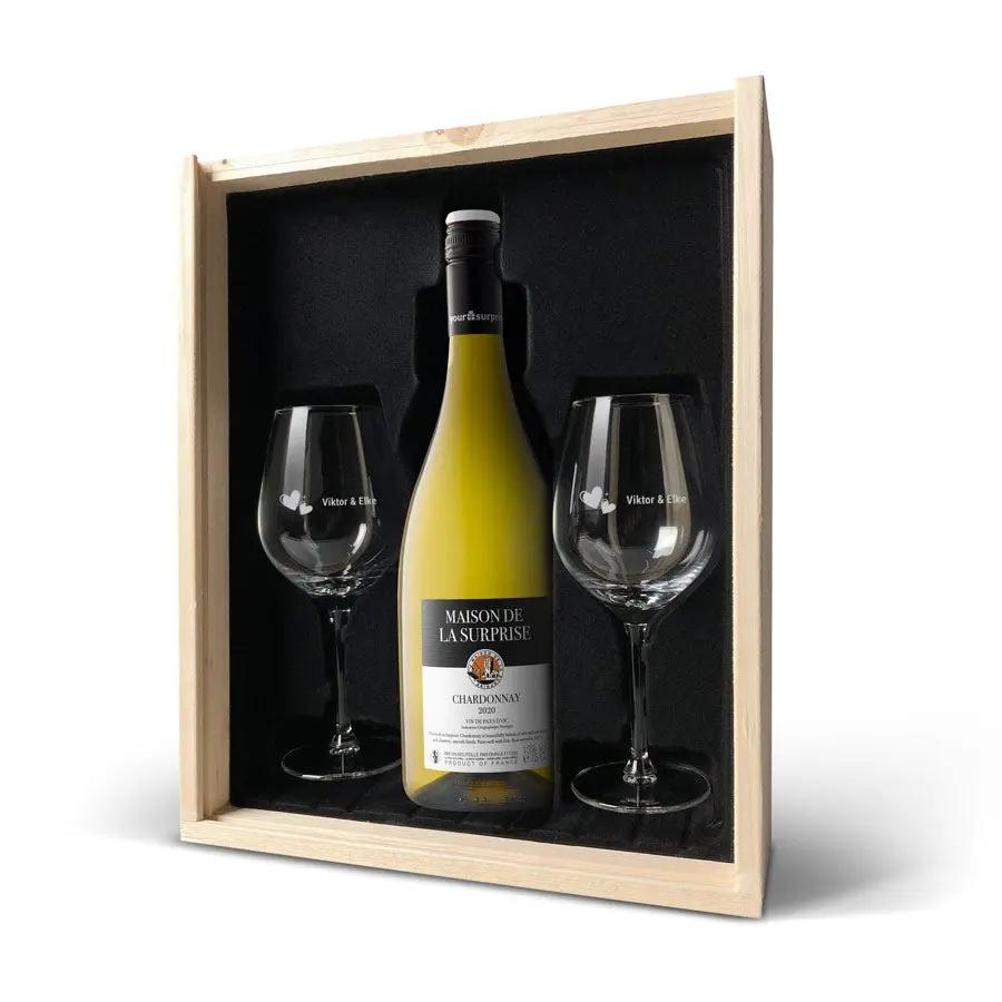 Weingeschenkset mit Gläsern - Maison de la Surprise Chardonnay - Gravierte Gläser