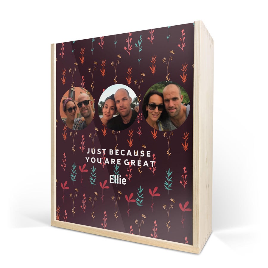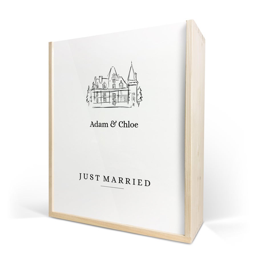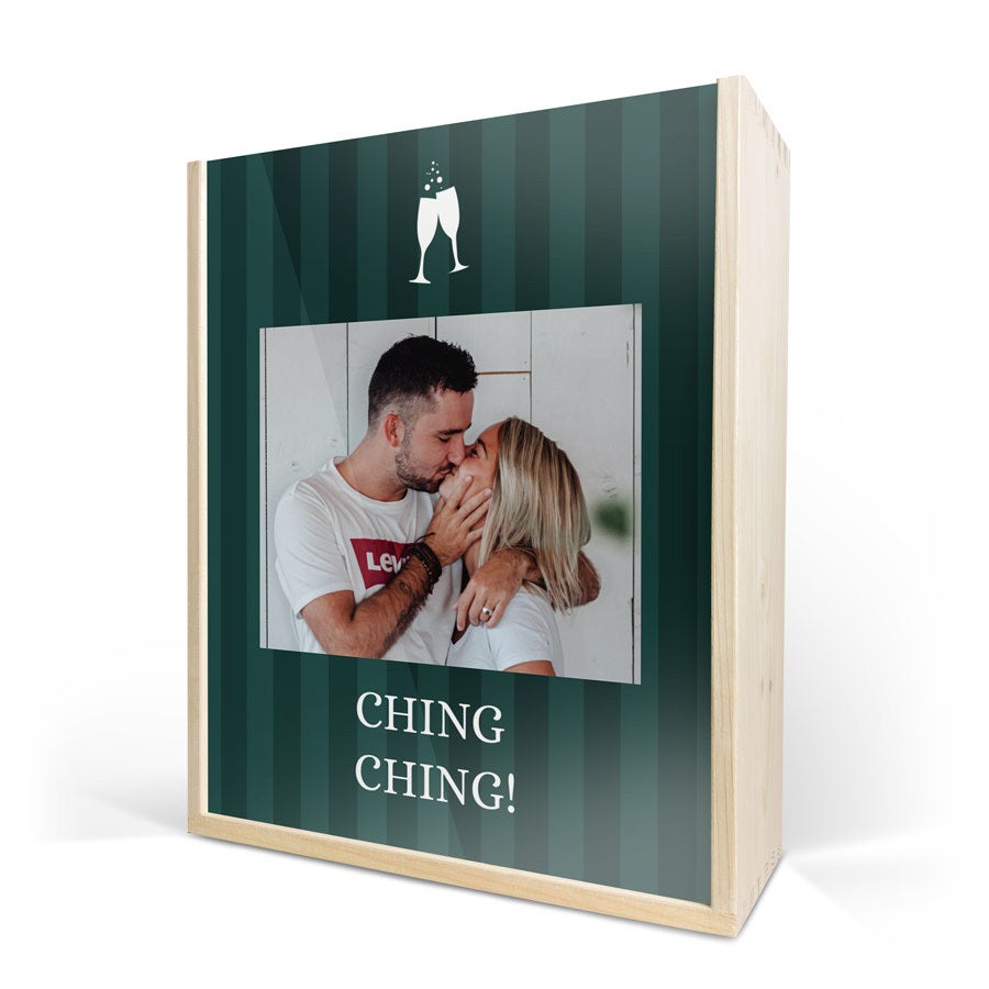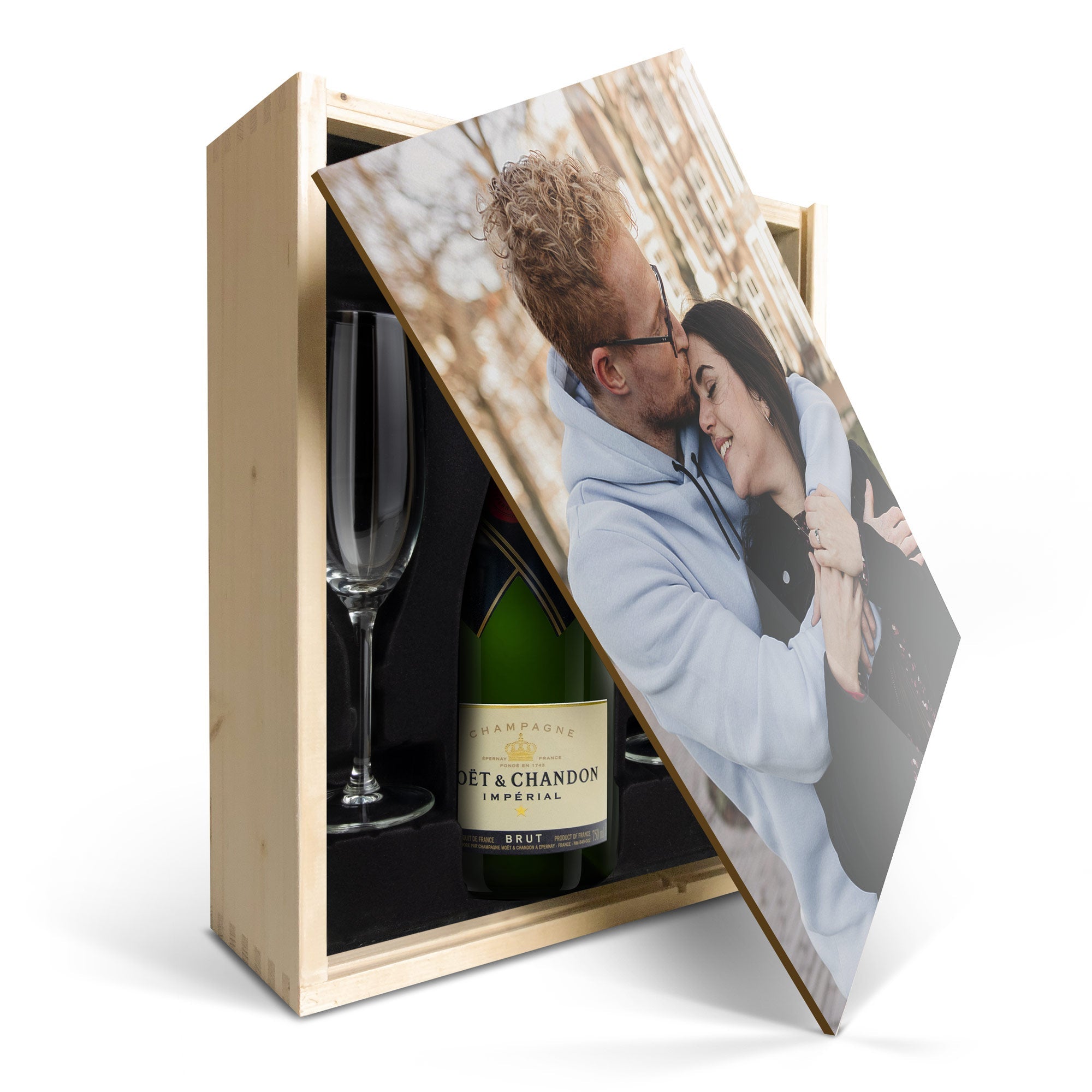 Eine exquisite Flasche Moët & Chandon Champagner mit zwei Gläsern. In einer luxuriösen, personalisierten Holzkiste mit Ihrem Design. Prost!