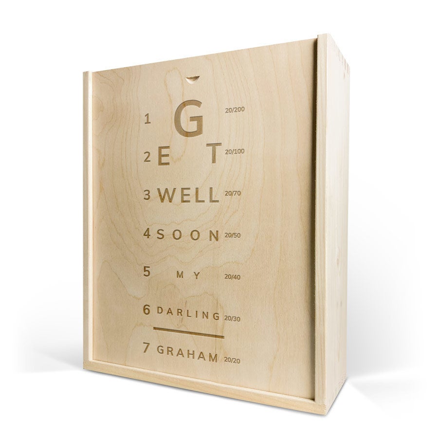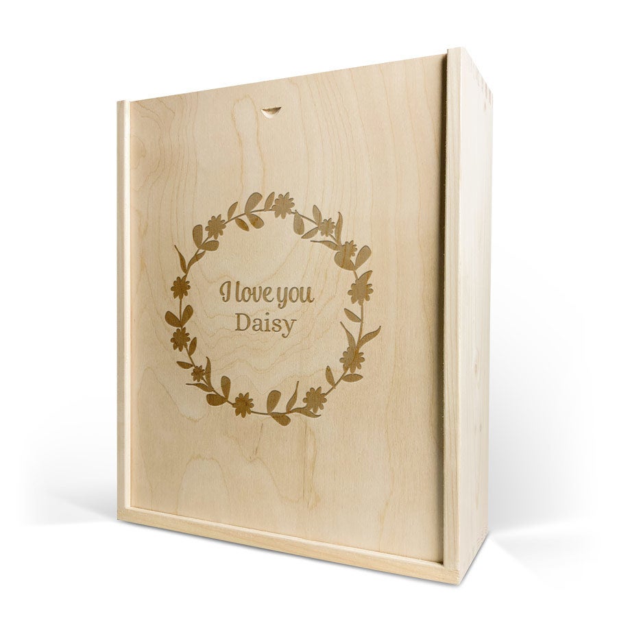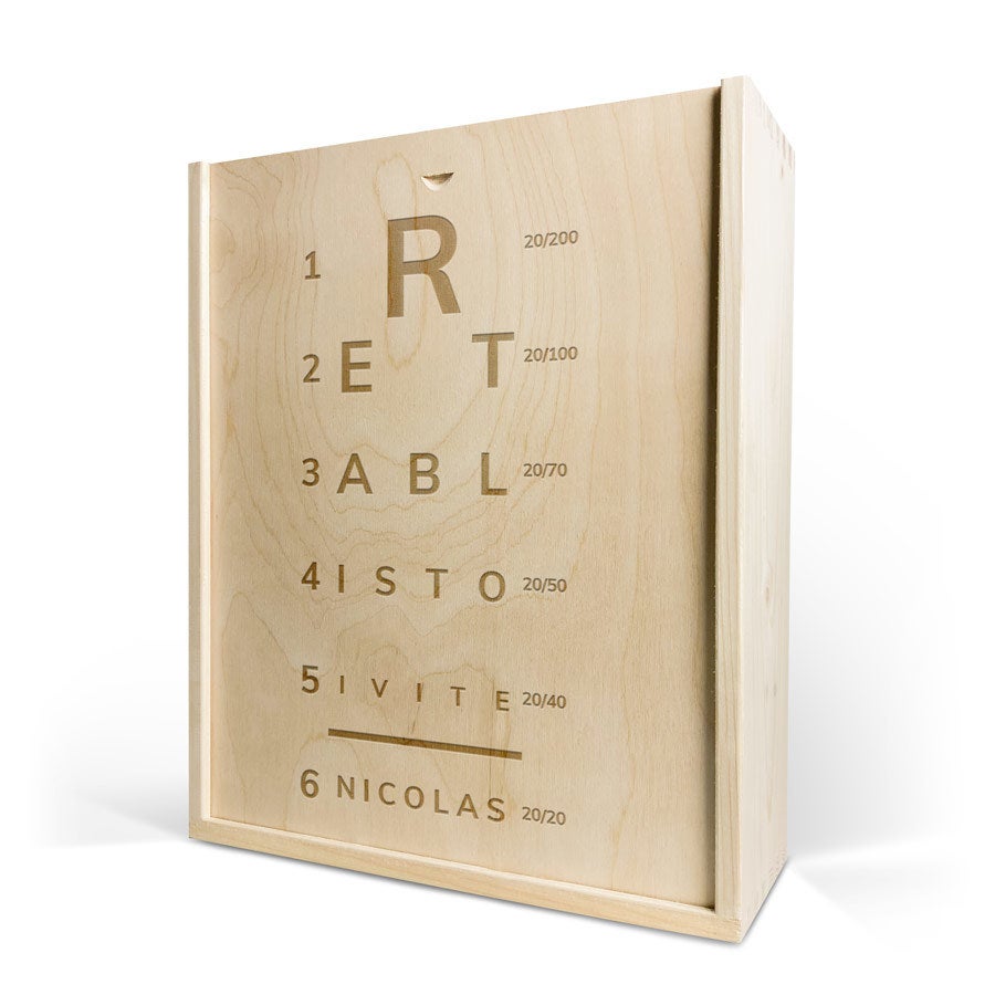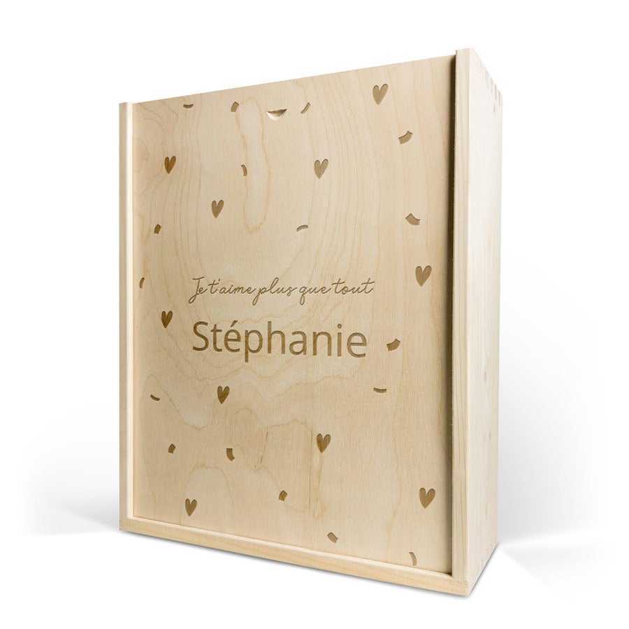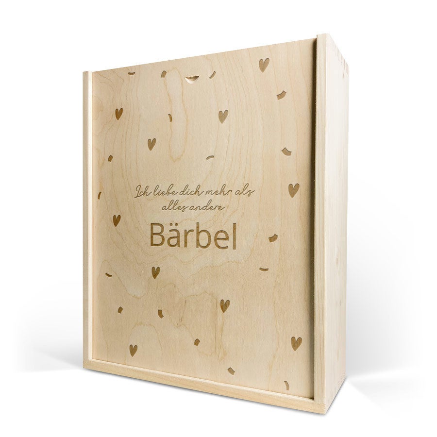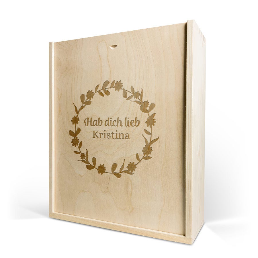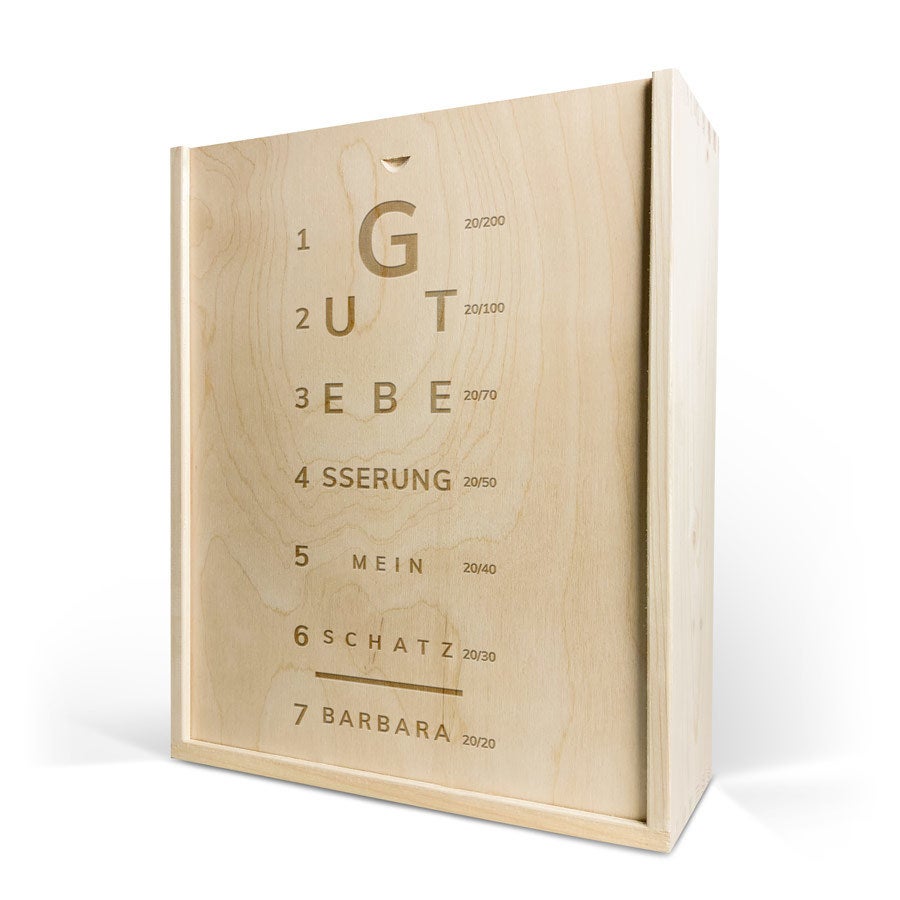 Eine köstliche Flasche Moët & Chandon Champagner mit zwei Gläsern. In luxuriöser gravierter Holzkiste, mit Ihrem Design. Prost!