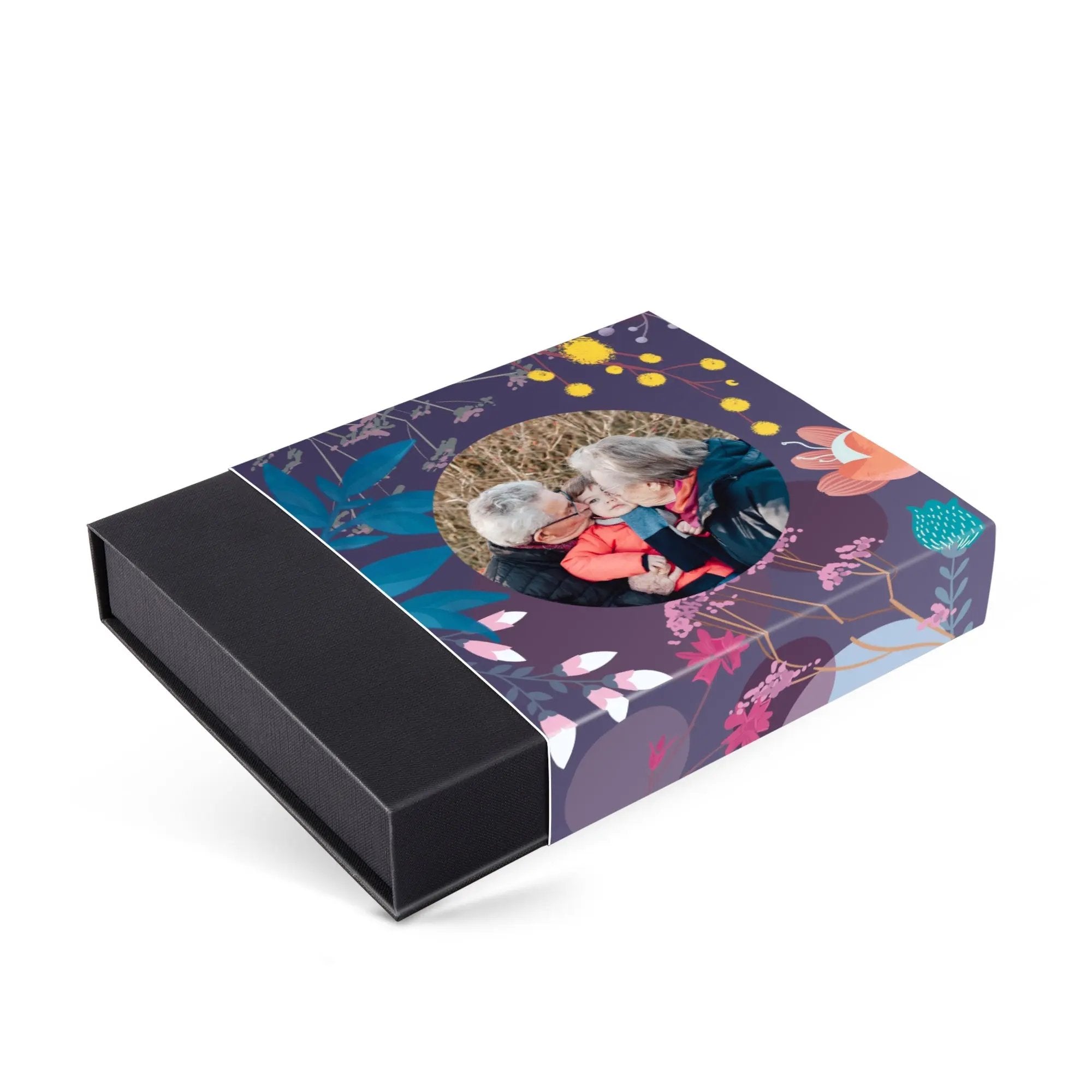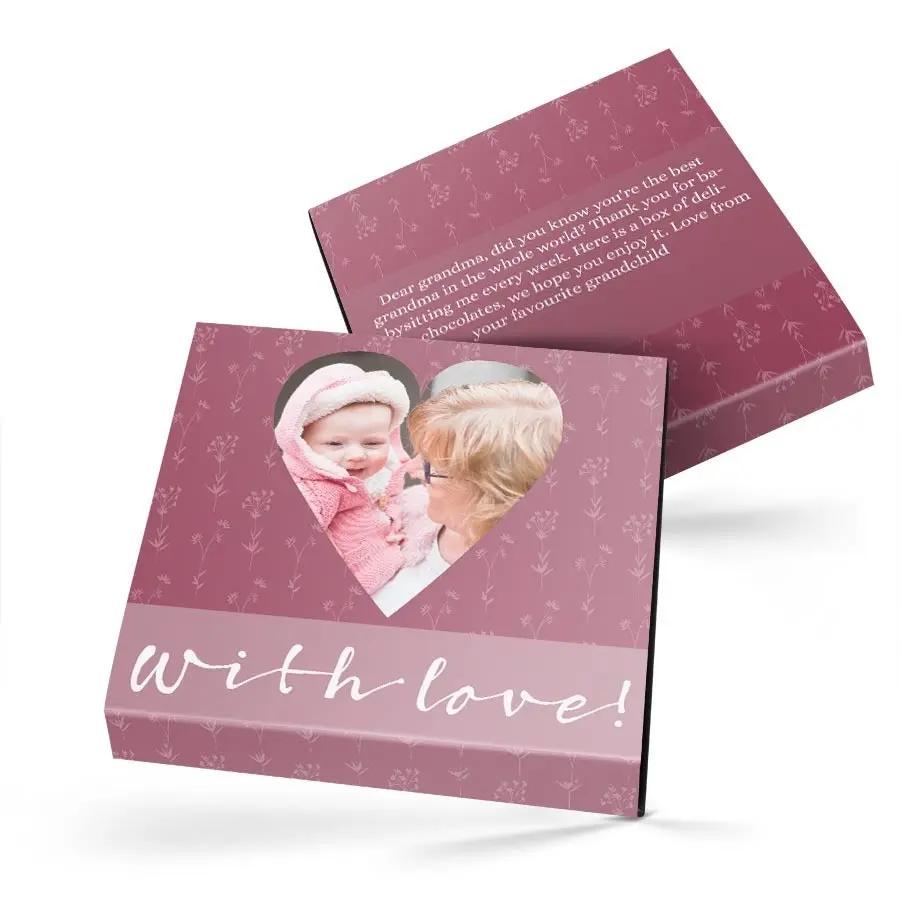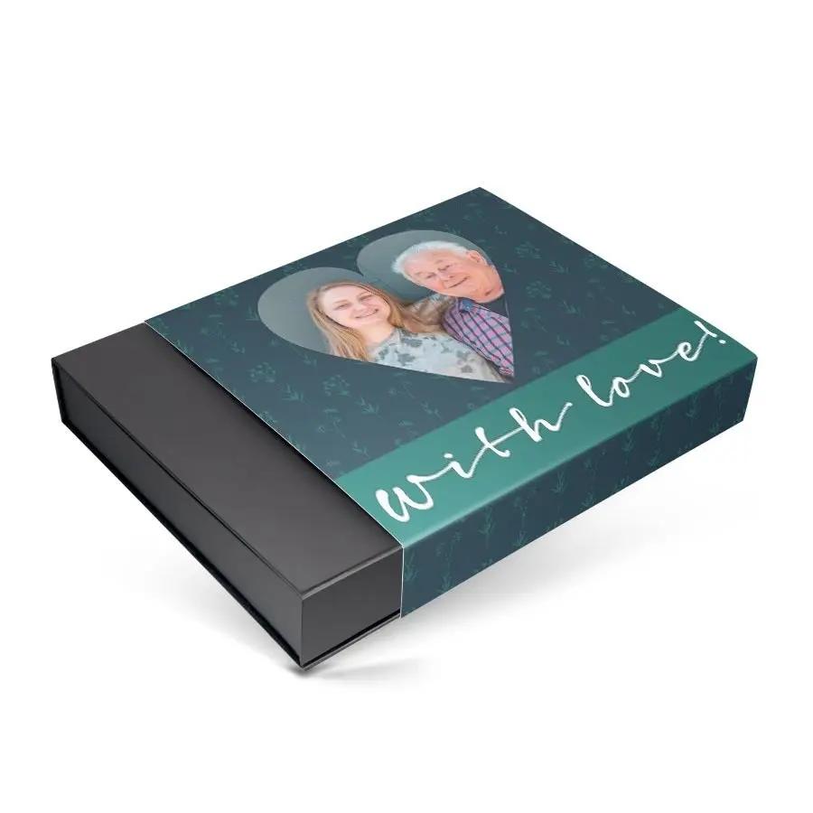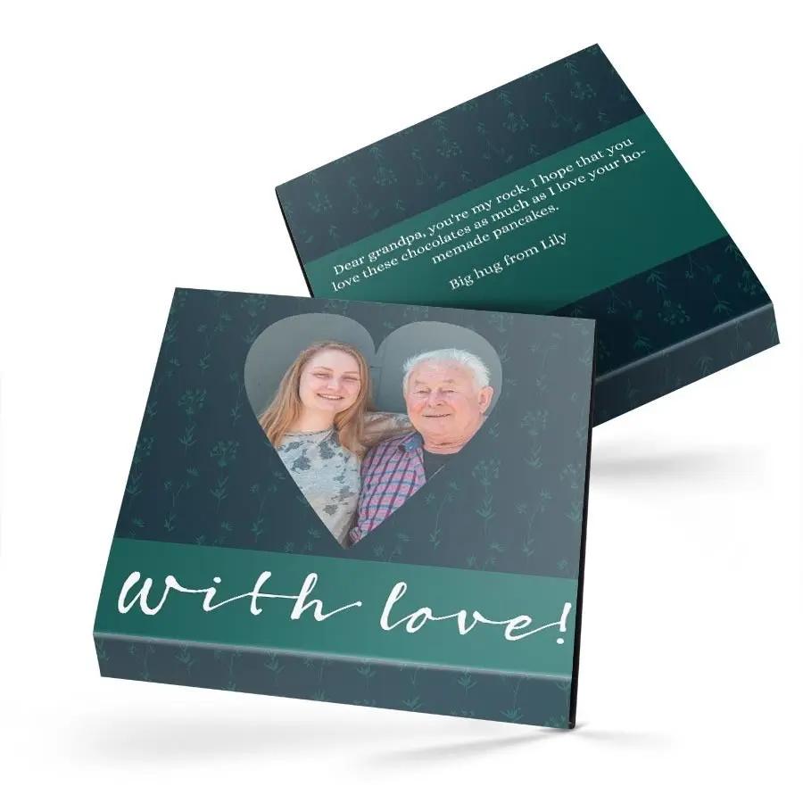 Überraschen Sie Ihre Liebsten mit Pralinen in einer luxuriösen Geschenkbox mit Ihrem Design. Köstliche Pralinen in einer Geschenkbox mit Foto und Namen! Weitere Informationen zur luxuriösen Pralinen-Geschenkbox: - Schokolade: handgefertigt - Anzahl der Pralinen: +/- 25 - Maße: 17,5 x 17 x 3,7 cm - Personalisierung: Foto und/oder Text vollfarbig auf die gesamte Verpackung gedruckt - Geschmacksrichtungen: von exotischer Hibiskus-Orange bis hin zu traditioneller Praline und Karamell - Bitte beachten Sie: Einige Pralinen enthalten Alkohol.