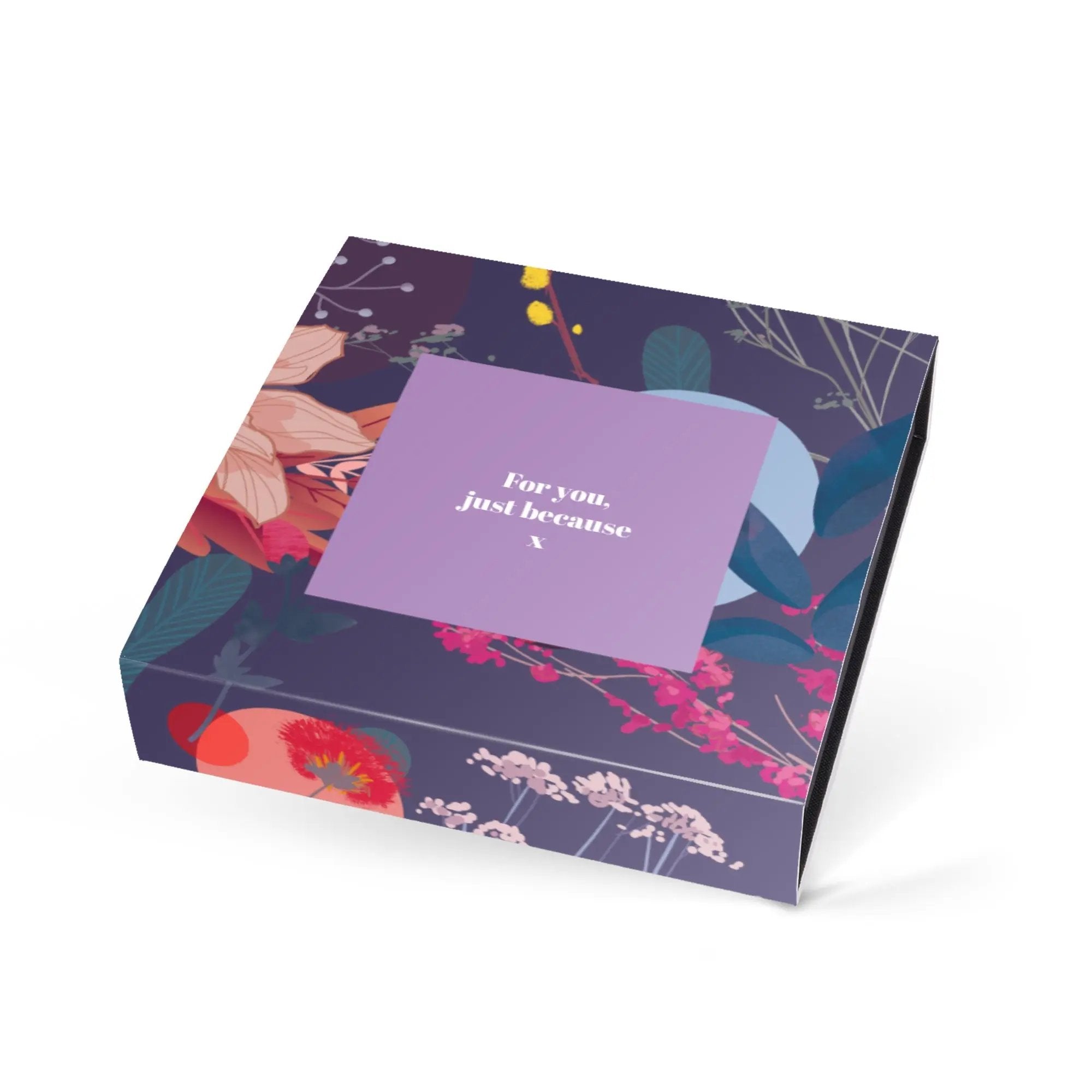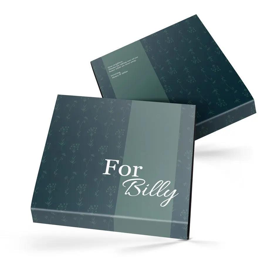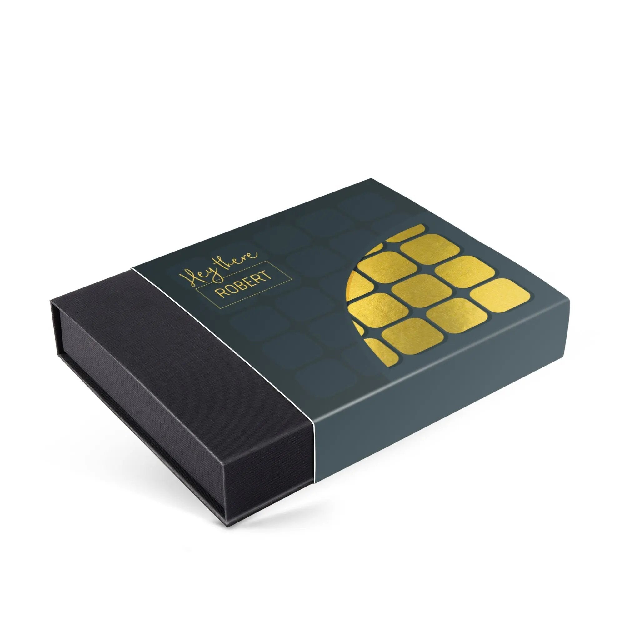 Überraschen Sie Ihre Liebsten mit Pralinen in einer luxuriösen Geschenkbox mit Ihrem Design. Köstliche Pralinen in einer Geschenkbox mit Foto und Namen! Weitere Informationen zur luxuriösen Pralinen-Geschenkbox: - Schokolade: handgefertigt - Anzahl der Pralinen: +/- 25 - Maße: 17,5 x 17 x 3,7 cm - Personalisierung: Foto und/oder Text vollfarbig auf die gesamte Verpackung gedruckt - Geschmacksrichtungen: von exotischer Hibiskus-Orange bis hin zu traditioneller Praline und Karamell - Bitte beachten Sie: Einige Pralinen enthalten Alkohol.