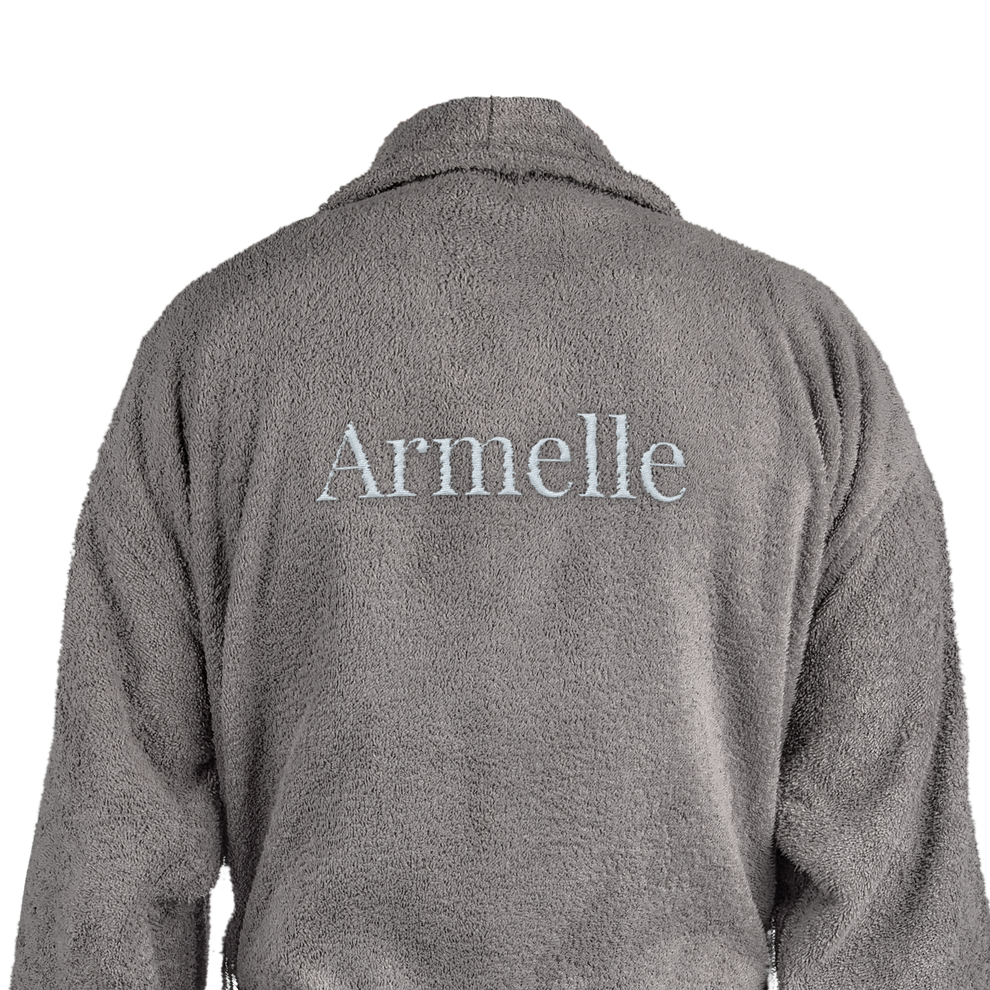 Weitere Informationen zum Bademantel: Farbe: grau Modell: Klassisch Material: 100 % Baumwoll-Frottee (380 g/m2) Größe: L/XL Höhe: 120 cm Breite: 65 cm Ärmellänge: 56 cm Schulterbreite: 21 cm Druck: eine Textzeile: 7 x 10 cm (H x B) Antistatisch und atmungsaktiv Waschanleitung: Bei maximal 60 Grad waschen.