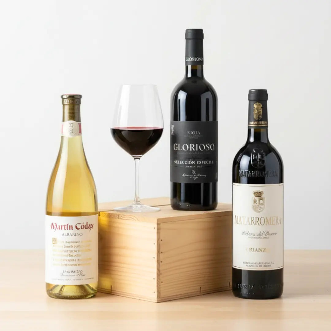Premium Spanische Weinkollektion, eine kuratierte Auswahl von 3 außergewöhnlichen Weinen aus renommierten spanischen Regionen: Martín Códax, Matarromera und Glorioso, jeder ausgewählt für seinen einzigartigen Charakter und seine Qualität.