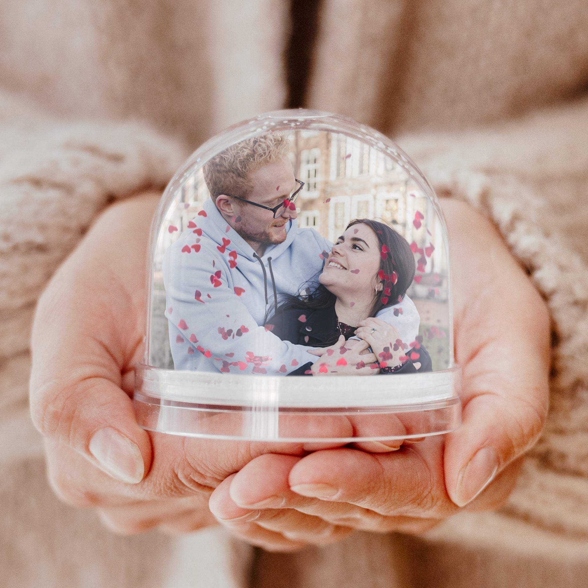Eine wunderschöne Schneekugel mit süßen Herzen, personalisiert mit dem Foto und/oder Text Ihrer Wahl. Ein wirklich originelles, persönliches Geschenk!