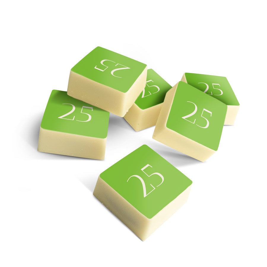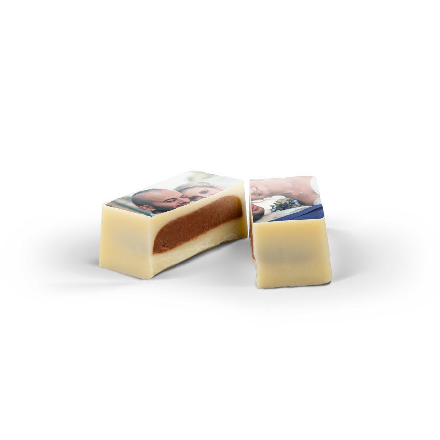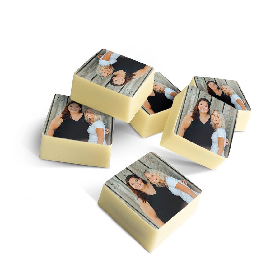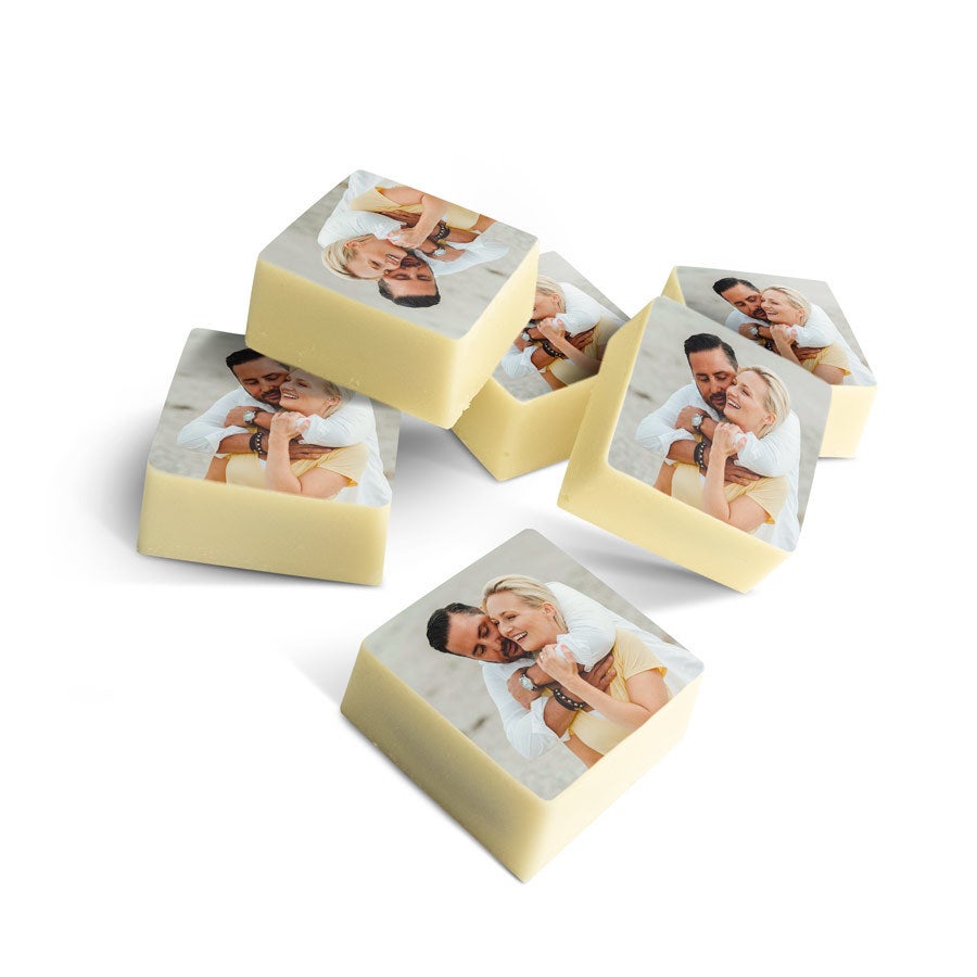 Mehr Informationen zu den personalisierten Schokoladenpralinen:Menge: Set mit 12, 24 oder 48 PralinenGröße: 2,6 x 2,6 x 1,2 cm pro Praline, kann pro Praline leicht variierenSchokolade: Milchschokolade mit einer Schicht weißer Schokolade obenaufForm: quadratischFüllung: PralinePersonalisierung: mit Foto oder Logo bedrucktDruck: essbarer Druck in VollfarbeBei Außentemperaturen von 25 Grad Celsius oder mehr können wir die Qualität der Schokolade nicht garantieren.Wichtig: Es ist nicht möglich, für jede einzelne Schokolade unterschiedliche Fotos zu verwendenAufbewahrungshinweis: Kann bis zu 10 Wochen an einem kühlen, dunklen Ort bei 14-18 °C gelagert werden. Allergiehinweis: Enthält Soja, Milch und kann Spuren von Nüssen und Gluten enthalten. Zutaten: Schokoladenpralinen mit Haselnussfüllung und essbarem Druck: Zucker, Haselnüsse, Kakaomasse, Kakaobutter, Vollmilchpulver, Emulgator (Sojalecithin), natürliches Vanillearoma. Essbarer Druck: Maisstärke, modifizierte Stärke: E1422, Kartoffelstärke, Wasser, Hühnereiweißpulver, Magermilchpulver, Olivenöl, Salz, Feuchthaltemittel E422, Emulgator: E433, Farbstoff: E102, E110, E122: Kann Aktivität oder Konzentration bei Kindern beeinträchtigen, E133, E151Überzug: E904