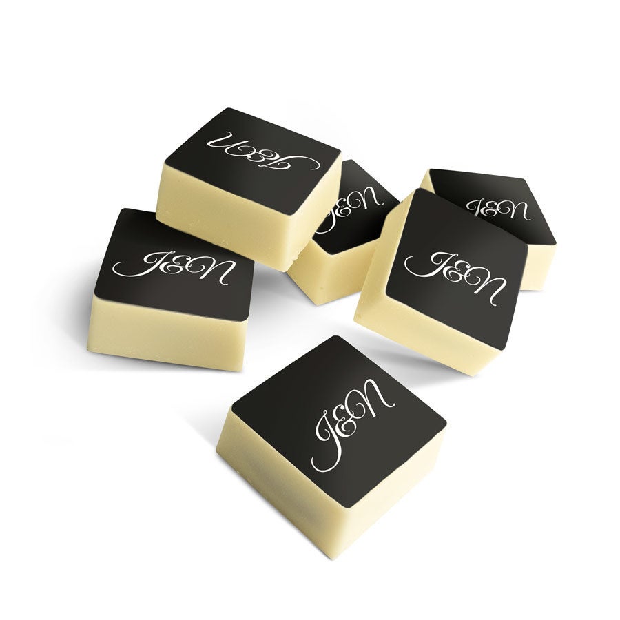 12 quadratische Schokoladenpralinen in eleganter Verpackung.