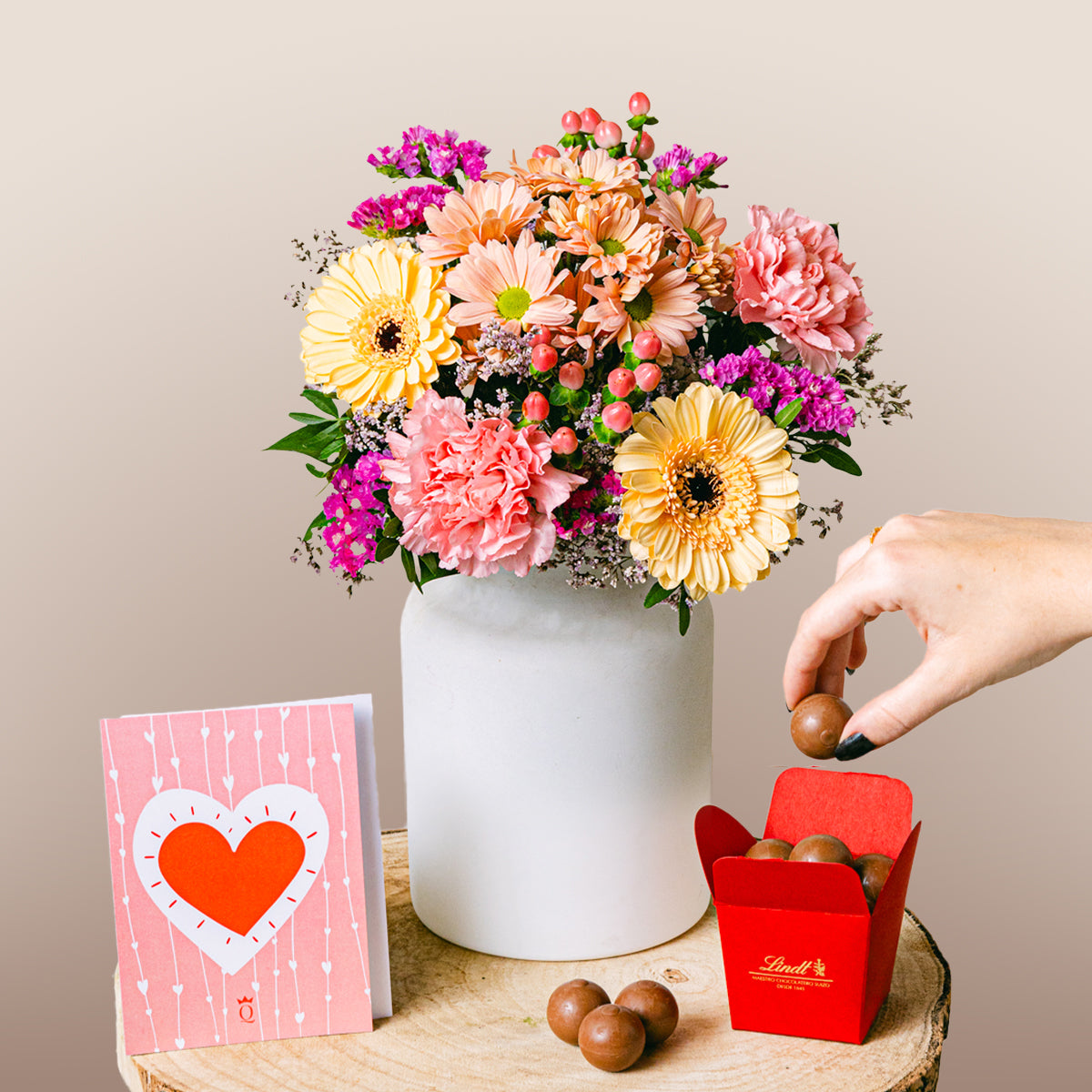 Die dezenten Pastelltöne der Gerbera und die leuchtend rosa Nelken schaffen eine emotionale Verbindung und wecken Gefühle von Glück und Wärme. Die orangefarbenen Chrysanthemen verleihen dem Strauß Tiefe und stehen für Freude und Optimismus. Zusammen bilden diese Blumen ein harmonisches Ensemble, das nicht nur das Auge erfreut, sondern auch die Stimmung hebt. Stellen Sie sich das aufrichtige Lächeln vor, das dieser Blumenstrauß dem Empfänger ins Gesicht zaubert, während er seinen Raum mit seiner lebendigen Farbpalette und herzerwärmenden Essenz erhellt.