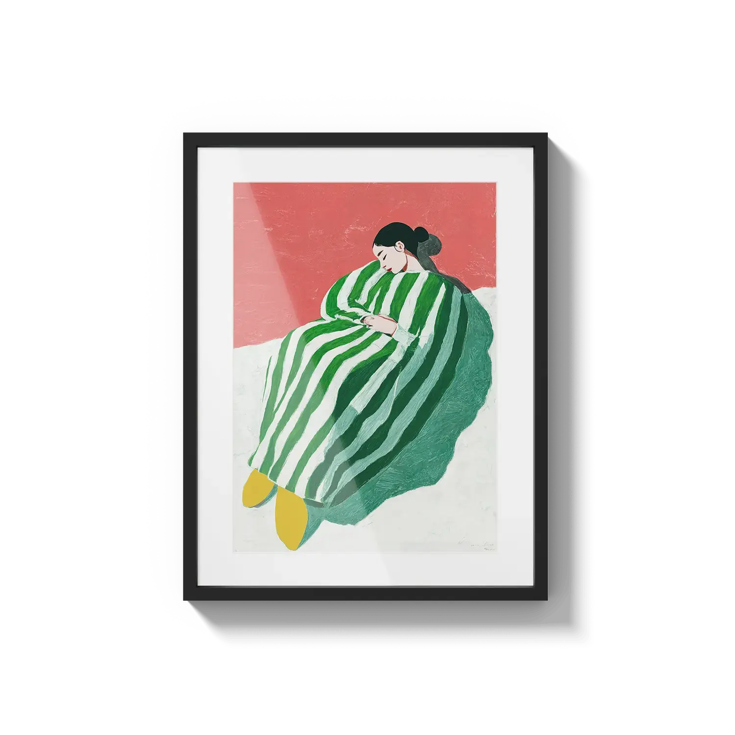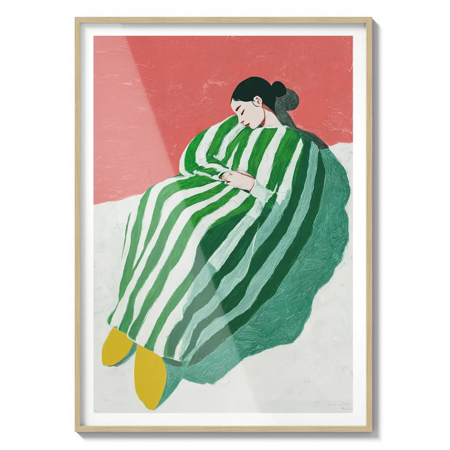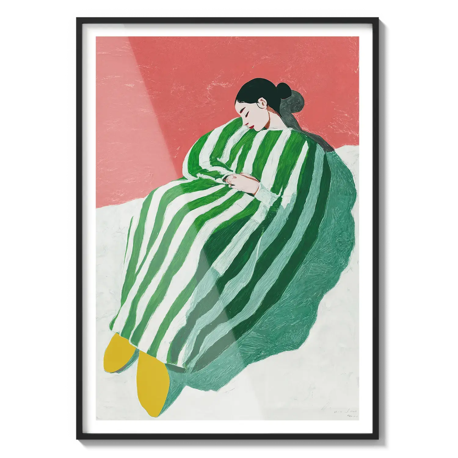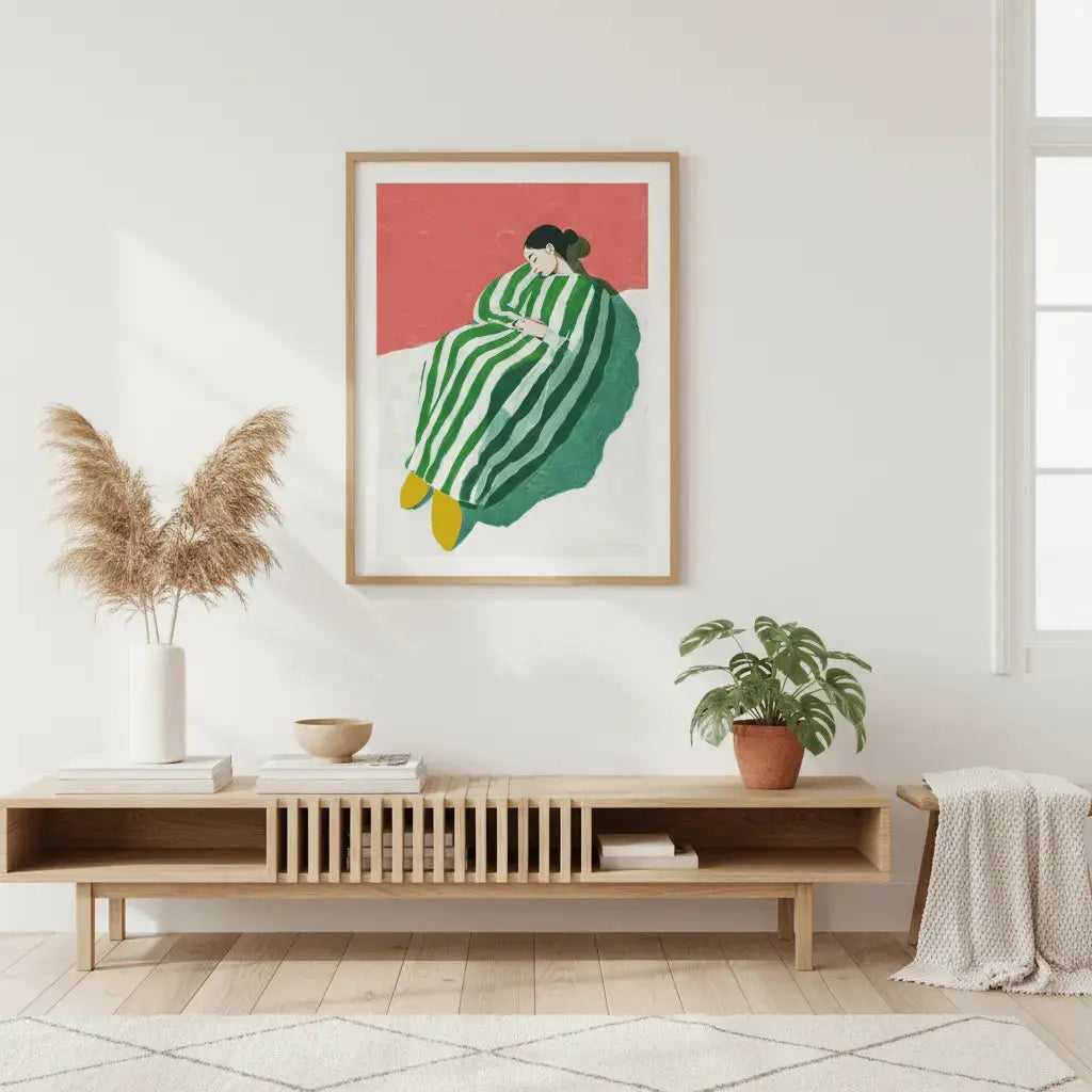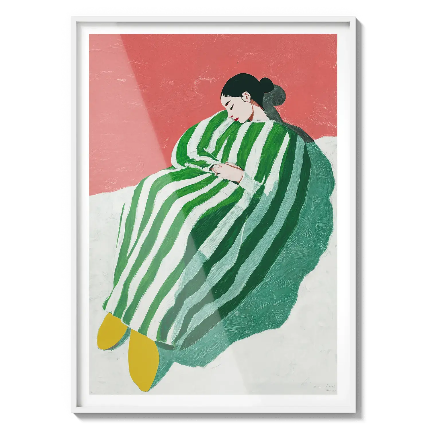 Eine Figur, eingehüllt in grüne und weiße Streifen, ruht mit stiller Leichtigkeit. Eine sanfte Einladung, langsamer zu werden.