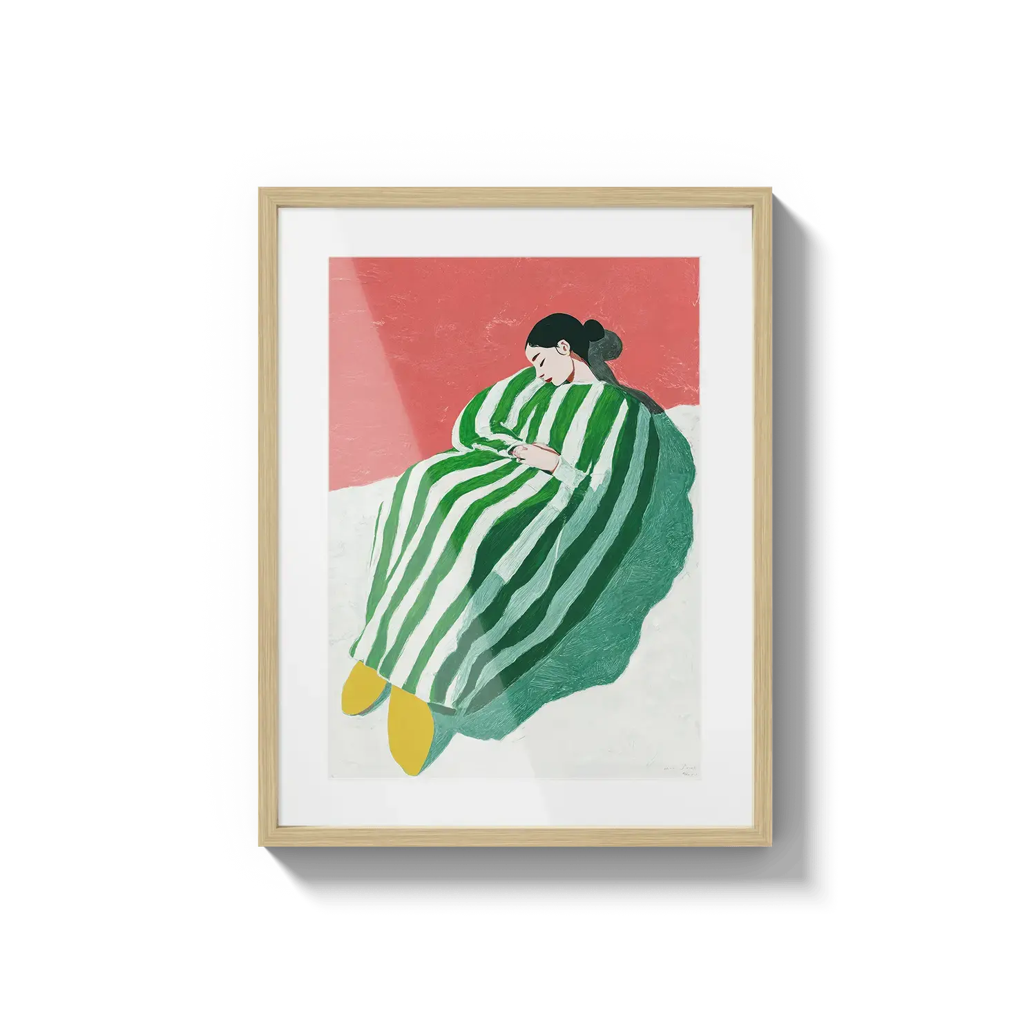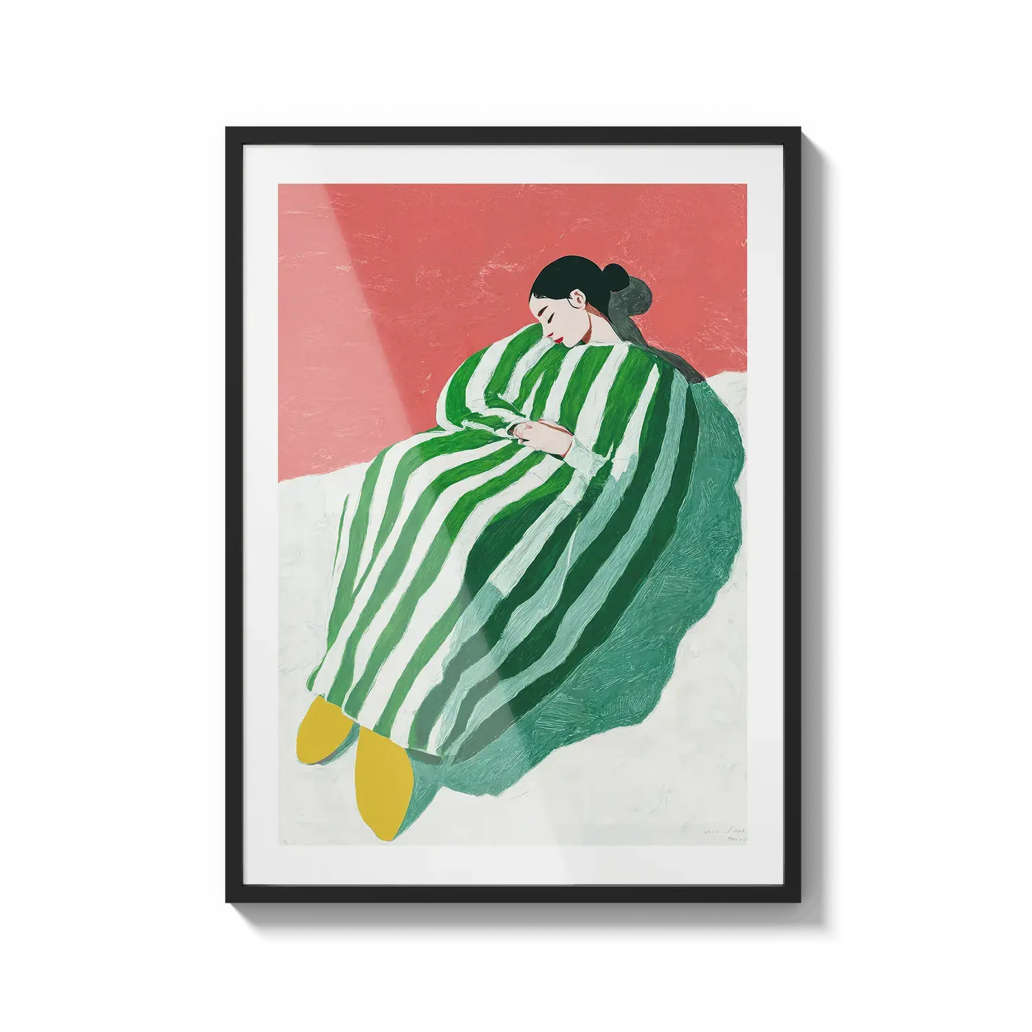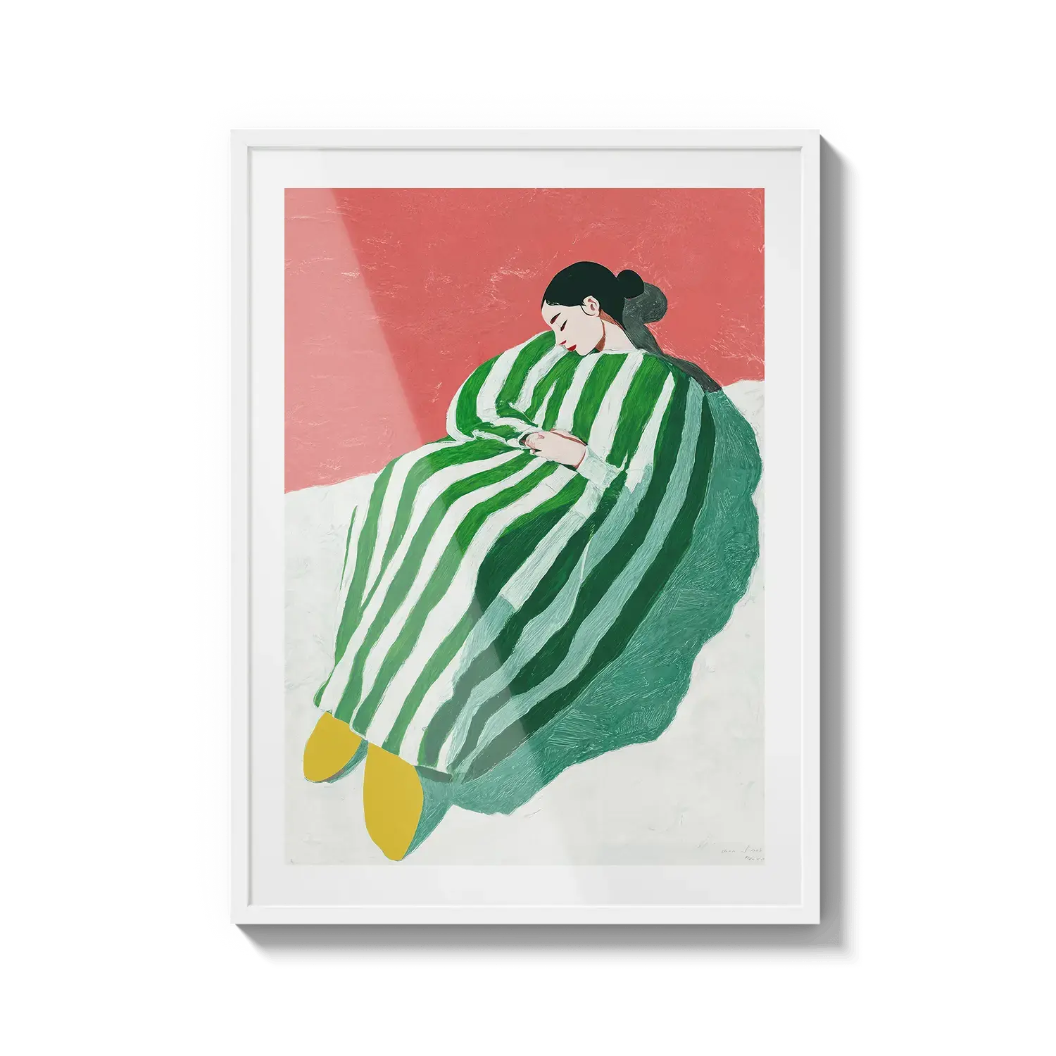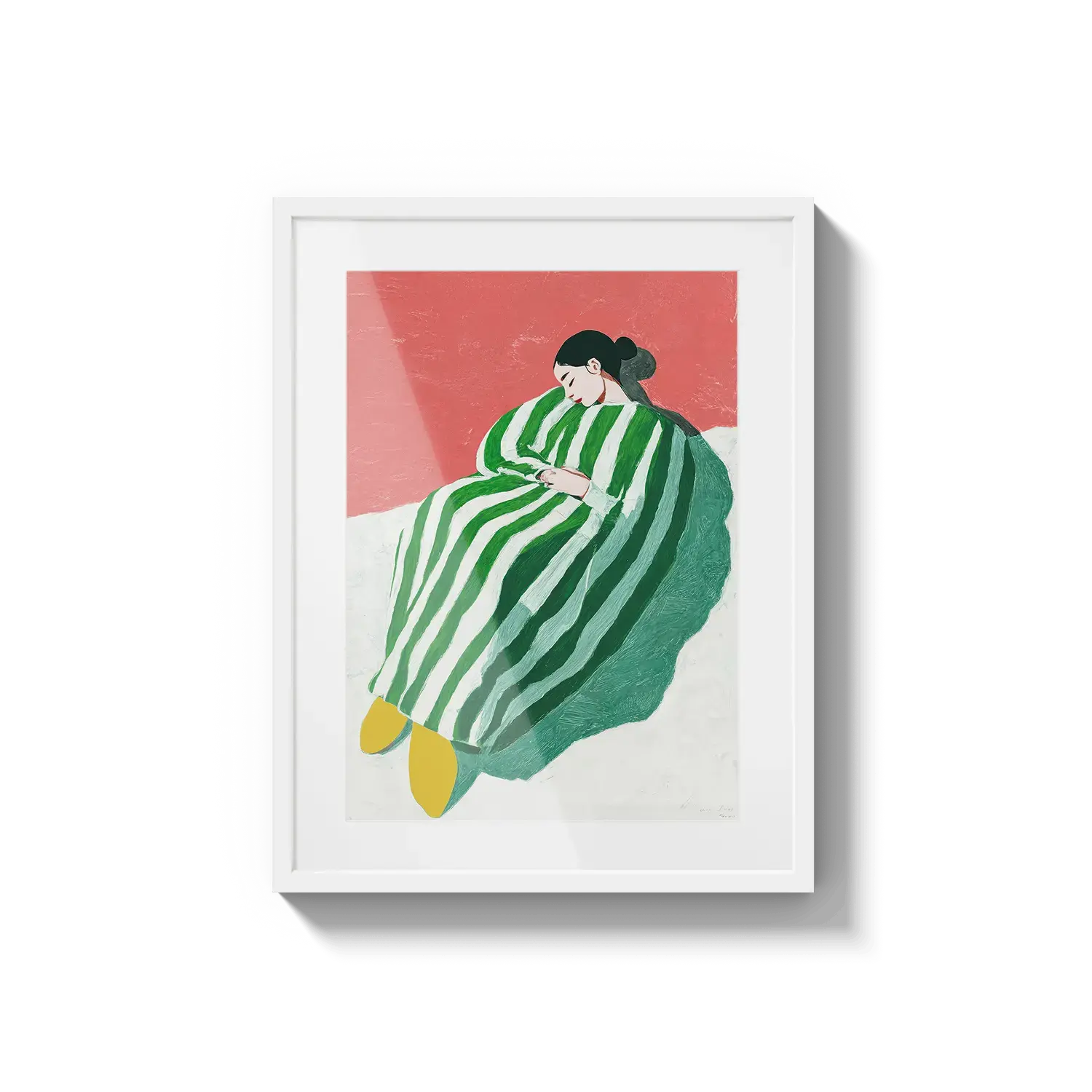 Eine Figur, eingehüllt in grüne und weiße Streifen, ruht mit stiller Leichtigkeit. Eine sanfte Einladung, langsamer zu werden.